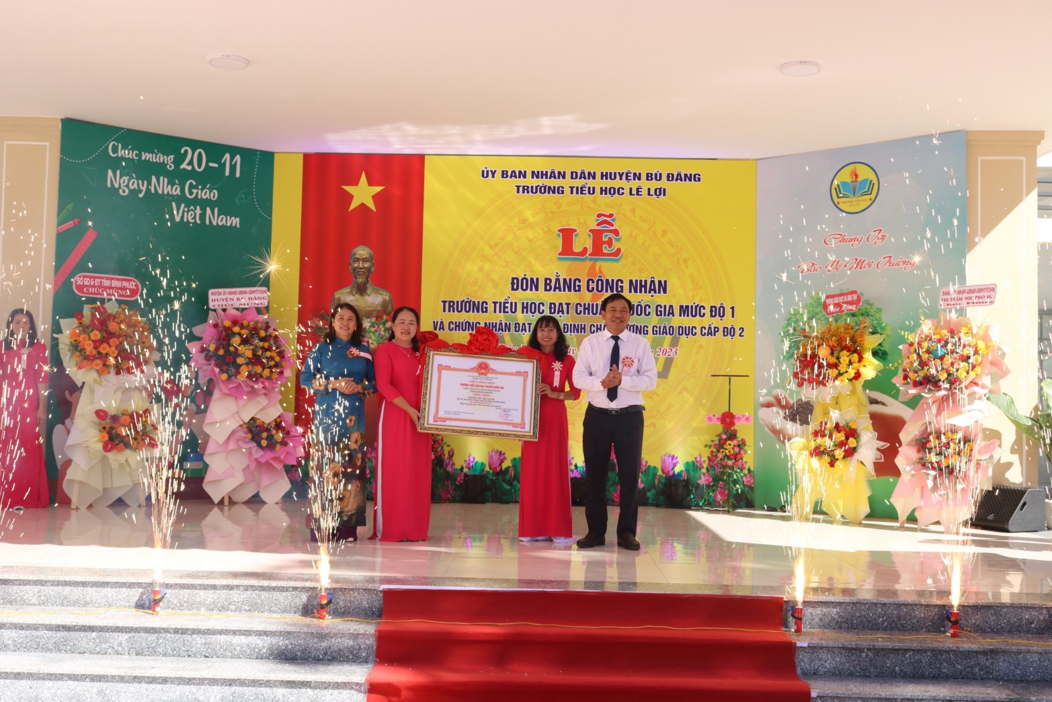 Phó Bí thư, chủ tịch UBND huyện Vũ Văn Mười; uỷ viên Ban thường vụ, Phó chủ tịch HĐND huyện Điểu Hà Hồng Lý trao bằng công nhận trường Lê Lợi, thị trấn Đức Phong đạt chuẩn Quốc gia mức độ I