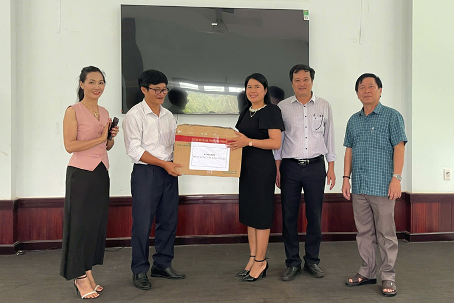 Bà Thị Diệu Hiền huyện uỷ viên, Phó chủ tịch UBND huyện tặng quà sản phẩm hạt điều rang muối đạt tiêu chuẩn OCOP, 4 sao cho lãnh đạo Văn phòng điều phối Chương trình mục tiêu Quốc gia xây dựng NTM tỉnh Ninh Thuận