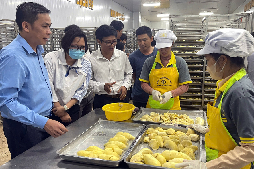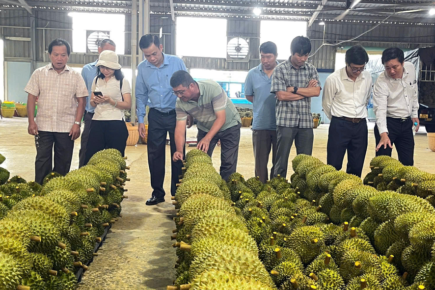 Đoàn thăm quan mô hình sản xuất chuỗi giá trị và thử chất lượng Sầu riêng của Công ty TNHH TM-ĐT Trường Thịnh Phát, thôn 8 xã Đức Liễu