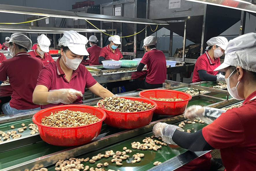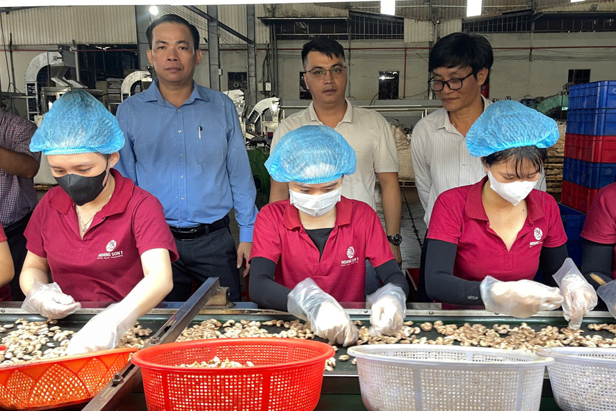 Đoàn tham quan dây chuyền sản xuất hạt điều của Công ty cổ phần Hoàng Sơn I, thôn 2, xã Đức Liễu