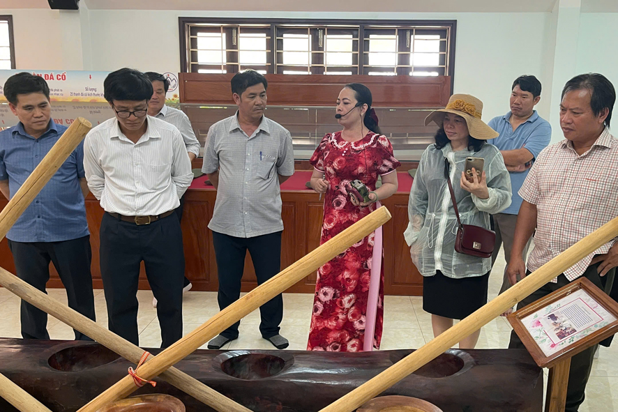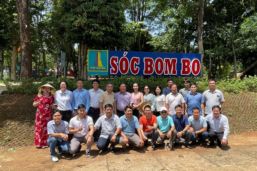 Đoàn thăm quan và chụp hình lưu niệm tại Khu bảo tồn văn hoá dân tộc S’tiêng Sóc Bom Bo, xã Bình Minh