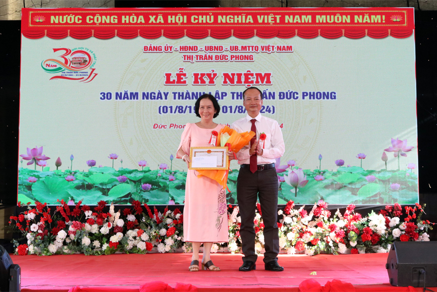 Ông Nguyễn Thế Hải uỷ viên Ban thường vụ huyện uỷ, Bí thư Đảng uỷ thị trấn Đức Phong thừa uỷ quyền của chủ tịch UBND huyện trao giấy khen biểu dương hộ gia đình bà Nguyễn Thị Thu Hương hiến 4000m2 trị giá khoảng 2,7 tỷ đồng