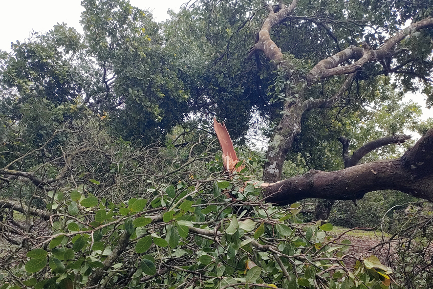 Lốc xoáy quét qua địa phận thôn 2 và thôn 8 xã Nghĩa Trung làm bật gốc, gãy đổ, gần 6ha cây Điều từ 10 năm tuổi trở lên và đè sập mái hiên tol của một hộ dân