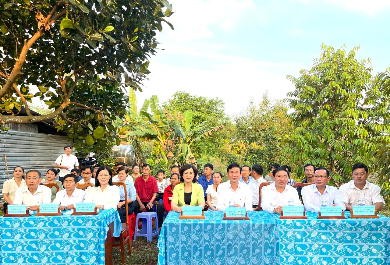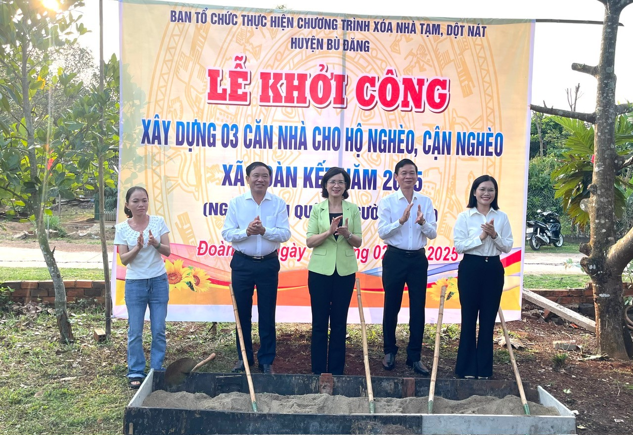 Ủy viên Ban Thường vụ Tỉnh ủy, Phó Chủ tịch UBND tỉnh Trần Tuyết Minh cùng lãnh đạo huyện Bù Đăng thực hiện nghi thức khởi công xây nhà.