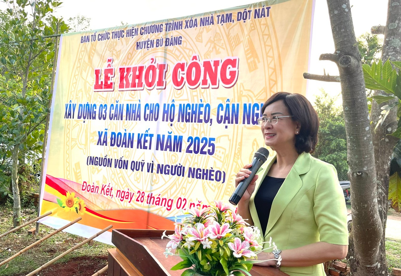 Phát biểu tại lễ khởi công, Ủy viên Ban Thường vụ Tỉnh ủy, Phó Chủ tịch UBND tỉnh Trần Tuyết Minh đề nghị địa phương tiếp tục quan tâm, hỗ trợ các hộ nghèo, cận nghèo; đồng thời từ sự hỗ trợ của cộng đồng, mỗi hộ nghèo, cận nghèo cần nỗ lực vươn lên, phát triển kinh tế gia đình để cải thiện cuộc sống.