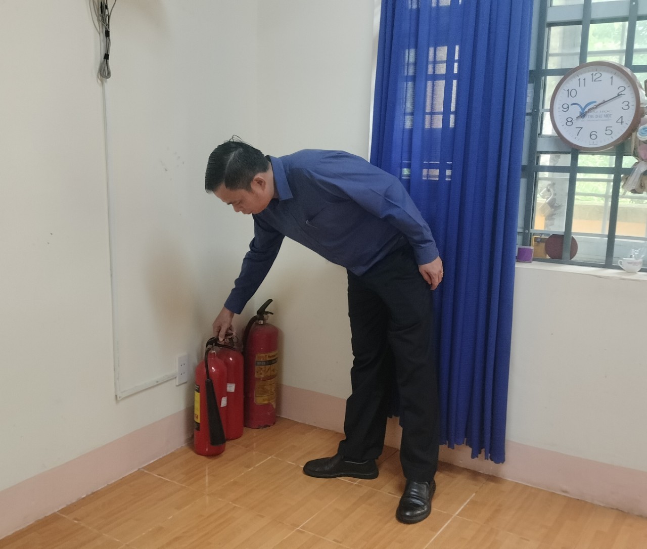 Phó Chủ tịch UBND huyện, Ủy viên Ban Chỉ đạo Kỳ thi tốt nghiệp THPT năm 2024 tỉnh Bình Phước Trần Văn Phương kiểm tra bình chữa cháy chuẩn bị an toàn cho kỳ thi.