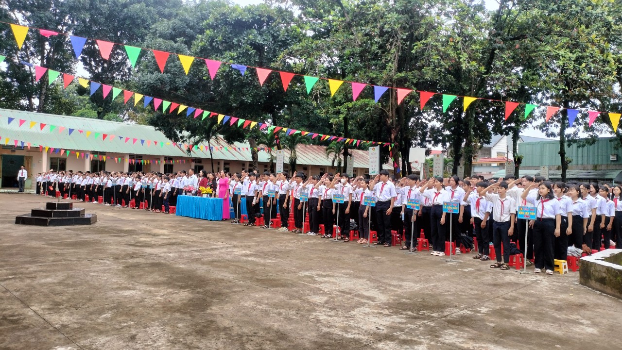 Thầy và trò trường THCS Minh Hưng thực hiện Nghi thức Chào cờ trong ngày khai giảng năm học mới.