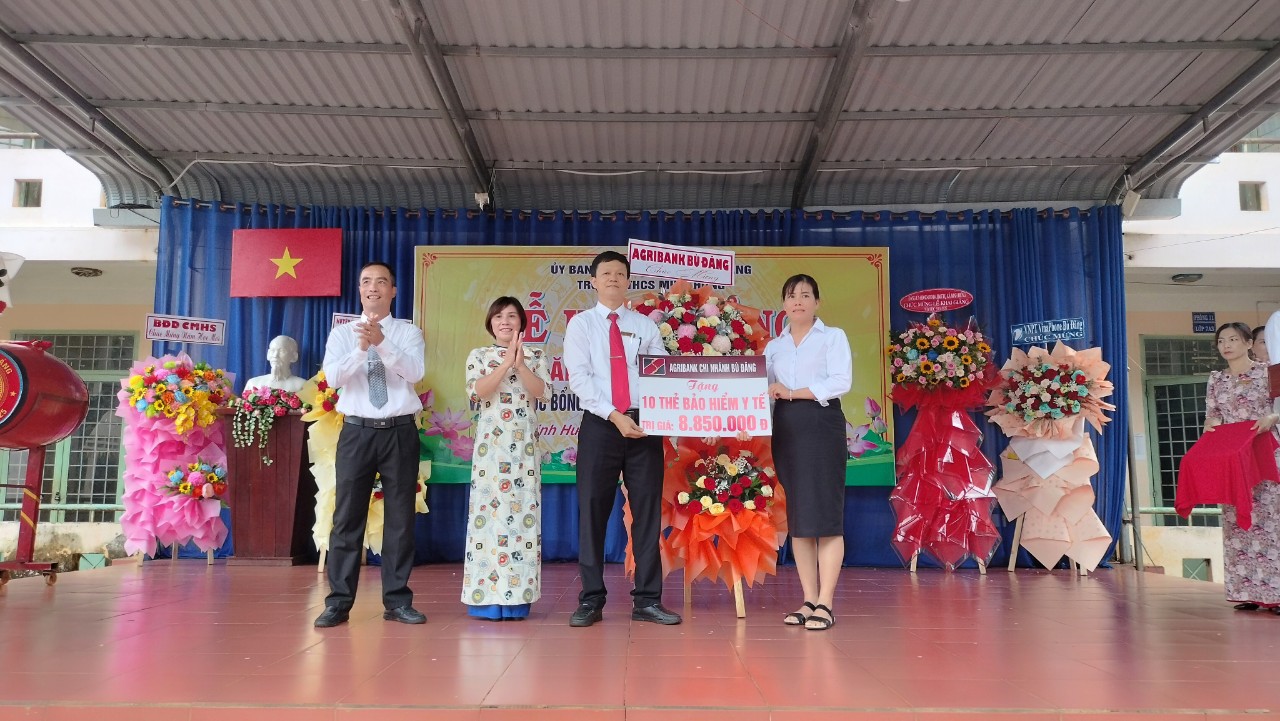 Lãnh đạo Ngân hàng Agribank Bù Đăng trao biểu trưng tặng thẻ BHYT cho học sinh nhân ngày khai trường.