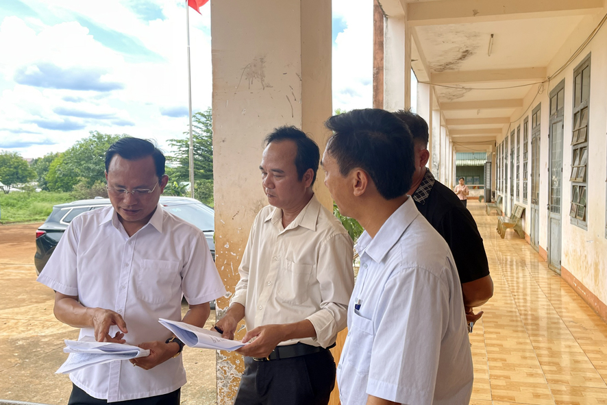 Phó chủ tịch UBND huyện Nguyễn Văn Lưu cùng lãnh đạo các phòng chuyên môn, đơn vị, trao đổi, khảo sát thực trạng cơ sở vật chất trên bản vẽ quy hoạch chi tiết tại trường Tiểu học Trần Quốc Toản, xã Đắk Nhau