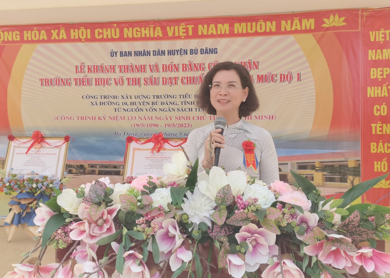 Phát biểu tại lễ khánh thành và đón Bằng công nhận "Trường Tiểu học đạt chuẩn Quốc gia mức độ I" tại trường Tiểu học Võ Thị Sáu. Ủy viên Ban Thường vụ Tỉnh ủy, Phó chủ tịch UBND tỉnh Trần Tuyết Minh chúc mừng Thầy và trò nhà trường. Đồng thời đề nghị huyện Bù Đăng tiếp tục quan tâm bố trí nguồn lực địa phương và vận động từ nguồn xã hội hóa đầu tư nhiều hơn cho khuôn viên nhà trường cũng như các trang thiết bị mà trường đang còn thiếu. Trong điều kiện cơ sở vật chất đã được tăng cường, các thầy cô giáo của trường tiếp tục nỗ lực trong công tác nhà phát huy truyền thống, tiếp tục nâng cao chất lượng giáo dục và đào tạo trên cơ sở phát huy và khai thác thật tốt, thật hiệu quả công trình đã được đầu tư xây dựng để ngày càng có nhiều thành tích trong dạy và học./.
