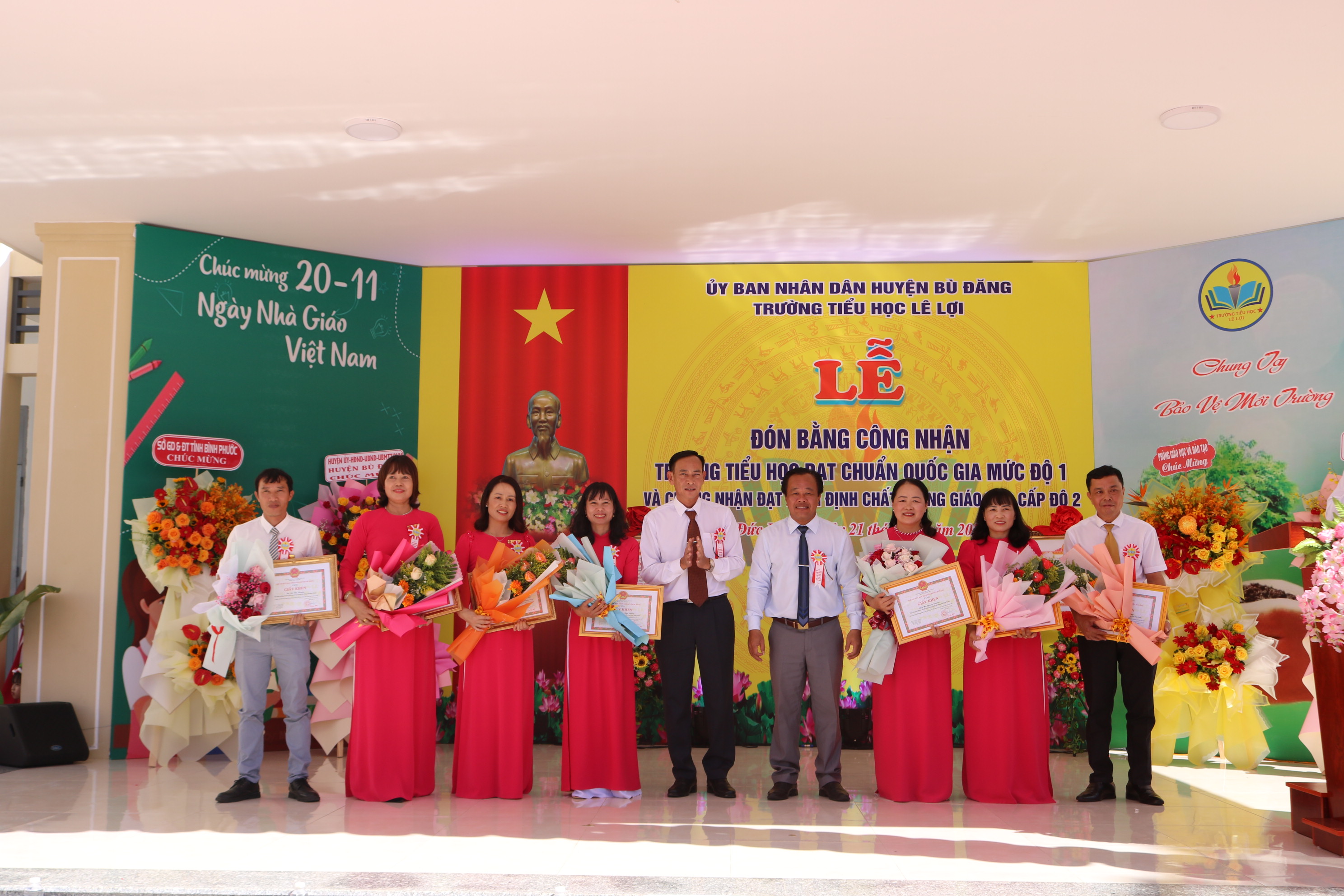 Tại buổi lễ, Trưởng Phòng Giáo dục và Đào tạo Nguyễn Văn Phát đã công bố Quyết định của Chủ tịch UBND tỉnh Bình Phước và Sở Giáo dục và Đào tạo về trao Bằng công nhận Trường Tiểu học Lê Lợi đạt chuẩn quốc gia mức độ 1 và bằng chứng nhận đạt kiểm định chất lượng giáo dục mức độ 2. Trường Tiểu học Lê Lợi được thành lập từ tháng 5/2017 và chính thức đi vào hoạt động từ năm học 2017-2018, thời điểm thành lập nhà trường tiếp nhận lại cơ sở vật chất cũ của Trung tâm GDTX huyện chuyển giao, cơ sở vật chất, trang thiết bị thiếu và nhiều điều kiện khó khăn khác. Trải qua 6 năm xây dựng và phát triển, nhà trường không ngừng phấn đấu để nâng cao chất lượng giáo dục, tự học, tự rèn, đoàn kết xây dựng tập thể nhà trường, Chi bộ đạt trong sạch vững mạnh các tổ chức, đoàn thể được vững mạnh, xuất sắc, đảm bảo các tiêu chí, tiêu chuẩn, theo Thông tư 13/2020/TT–BGDĐT, theo đó chất lượng dạy và học trong 3 năm học liên tiếp từ 2020 đến 2023 trường được UBND tỉnh tặng lá cờ đầu khối thi đua các Trường Tiểu học trong toàn huyện. Hiện nay trường có 28 cán bộ, giáo viên, nhân viên (CB-GV-NV), đảm bảo đủ số lượng và loại hình theo qui định hiện hành, 100% giáo viên đạt chuẩn về trình độ đào tạo, kết quả hằng năm có nhiều giáo viên đạt giáo viên giỏi, chiến sĩ thi đua các cấp đặc biệt có 5 cán bộ, giáo viên được Thủ tướng chính phủ tặng bằng khen. Trường có 15 lớp học với 551 học sinh, 100% học sinh được học 2 buổi/ngày, là ngôi trường tiểu học đầu tiên của huyện thực hiện mô hình trường bán trú đã mang lại lợi ích cho học sinh, gia đình và xã hội. Kết quả học tập nhiều năm qua có nhiều học sinh giỏi các cấp, tỷ lệ học sinh lên lớp và hoàn thành chương trình lớp học, hoàn thành Chương trình tiểu học học đạt 100%; Nhà trường huy động tốt các nguồn lực xã hội hóa giáo dục để xây dựng nhiều công trình tiêu biểu như: sân chơi bãi tập, sân đa năng, mái che, nhà vệ sinh… Với những kết quả đạt được, Trường Tiểu học Lê Lợi vinh dự được đón nhận bằng công nhận đạt chuẩn quốc gia mức độ 1 và chứng nhận đạt kiểm định chất lượng giáo dục mức độ 2. Đây là nguồn động viên, khích lệ to lớn, là món quà tinh thần quý giá để thầy và trò nhà trường tiếp tục phấn đấu đạt nhiều thành tích cao hơn trong thời những năm tiếp theo. Phát biểu tại buổi lễ, Phó Bí thư Huyện ủy - Chủ tịch UBND huyện Vũ Văn Mười ghi nhận và biểu dương những kết quả mà thầy và trò Trường Tiểu học Lê Lợi đã đạt được trong thời gian qua. Đồng thời đề nghị, nhà trường tiếp tục phát huy, thực hiện đổi mới phương pháp trong quản lý và dạy học; thực hiện tốt quan điểm của Đảng về dạy chữ, dạy người và dạy nghề. Tổ chức tốt các hoạt động văn thể mỹ để tạo niềm tin cho phụ huynh đối với nhà trường, thường xuyên phối hợp thực hiện tốt 3 môi trường giáo dục “Gia đình, nhà trường và xã hội” để từ đó là tiền để để xây dựng thương hiệu cho nhà trường với phương châm “Mỗi ngày đến trường là một ngày vui” Dịp này, UBND huyện khen thưởng 01 tập thể và 07 cá nhân có thành tích xuất sắc trong xây dựng Trường Tiểu học Lê Lợi đạt chuẩn Quốc gia./.