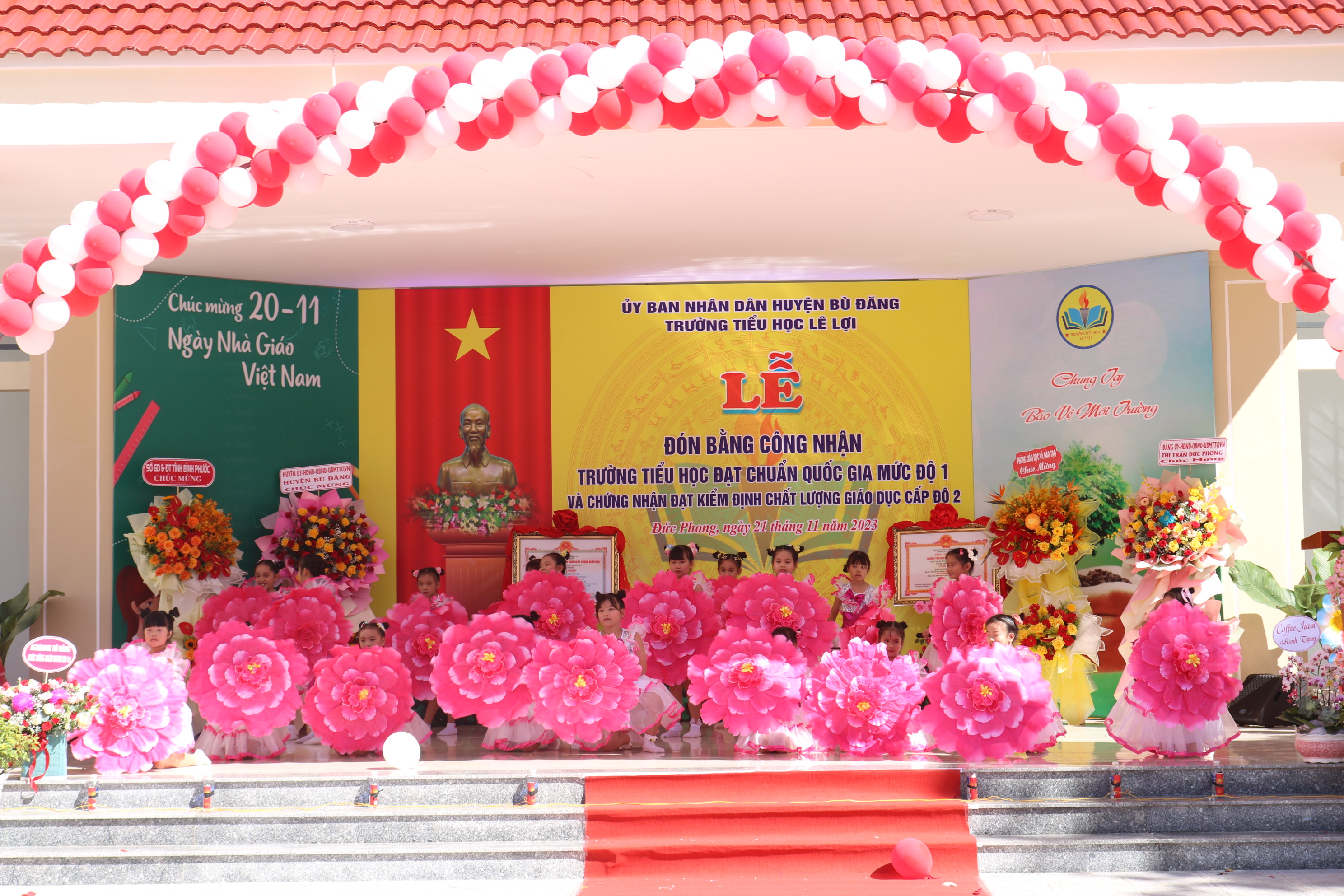Trong không khí tưng bừng của cả nước chào mừng kỷ niệm 41 năm Ngày nhà giáo Việt Nam (20-11-1982-20-11-2023). Sáng ngày 21/11/2023, Trường tiểu học Lê Lợi, thị trấn Đức Phong, huyện Bù Đăng, tỉnh Bình Phước long trọng tổ chức lễ đón Bằng công nhận trường đạt chuẩn quốc gia mức độ 1 và chứng nhận đạt kiểm định chất lượng giáo dục mức độ 2.