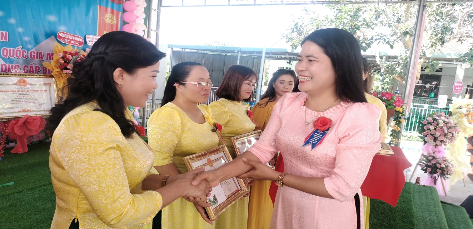 Lãnh đạo huyện trao trao Giấy khen của UBND huyện Bù Đăng cho 1 tập thể, 6 cá nhân có nhiều đóng góp trong quá trình xây dựng trường đạt chuẩn quốc gia.