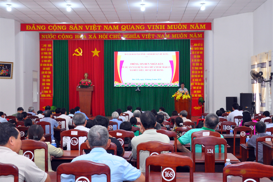 Tại hội nghị, Ban QLDAĐTXD tỉnh đã thông tin đến Nhân dân về tình hình thực hiện Dự án Cụm công trình thuỷ lợi vùng cao biên giới tỉnh Bình Phước trong đó có Dự án xây dựng Hồ chứa nước Đarana. Theo đó, Dự án xây dựng Hồ chứa nước Đarana có diện tích thu hồi đất là 37,3ha với 89 hộ dân bị thu hồi đất, đến nay chỉ có 85/89 hộ đồng thuận bàn giao mặt bằng, còn 04 hộ chưa đồng ý bàn giao mặt bằng, dẫn đến mùa khô năm 2023 – 2024 các hộ dân quanh khu vực hồ không có đủ nước để tưới phục vụ sản xuât nông nghiệp, khô hạn làm ảnh hưởng tới sự sinh trưởng cũng như năng suất cây trồng, các hộ dân đã có đơn kiến nghị UBND huyện Bù Đăng sớm đưa công trình vào hoạt động.