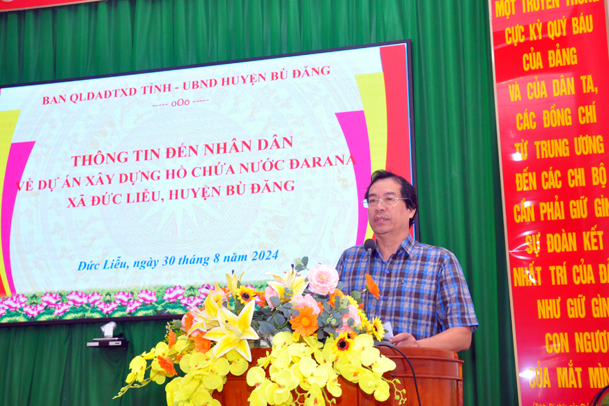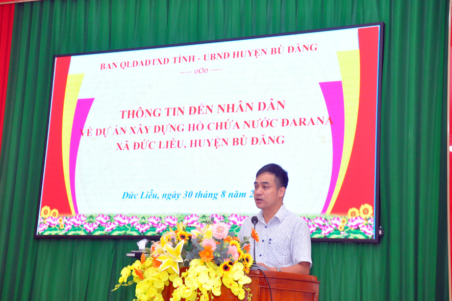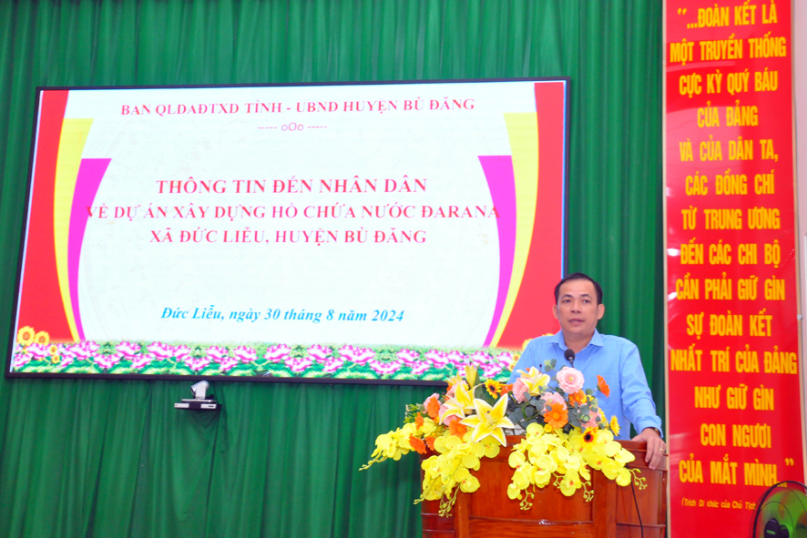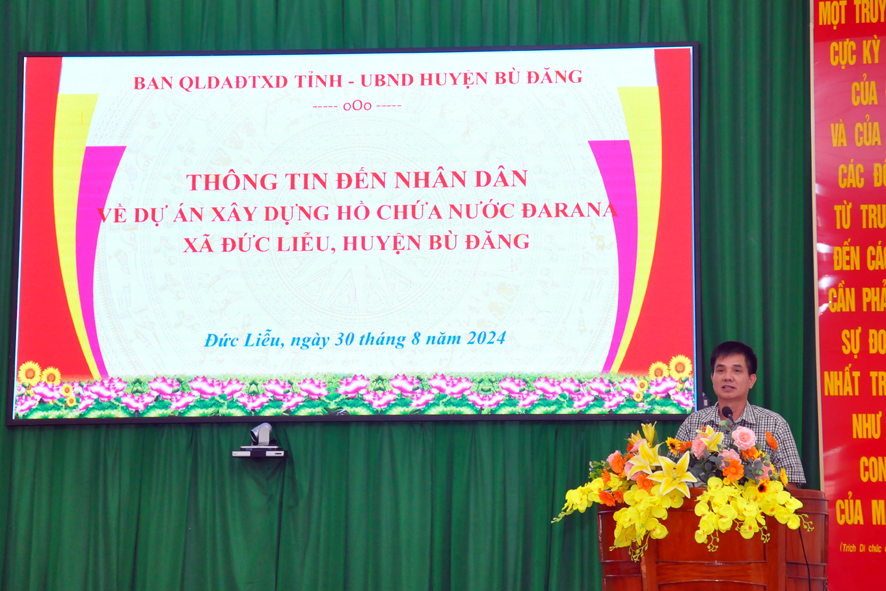 Ông Trần Phương Nam Phó Giám đốc Ban QLDAĐTXD tỉnh thông tin đến Nhân dân về tình hình thực hiện Dự án xây dựng Hồ chứa nước Đarana, thôn 6, xã Đức Liễu