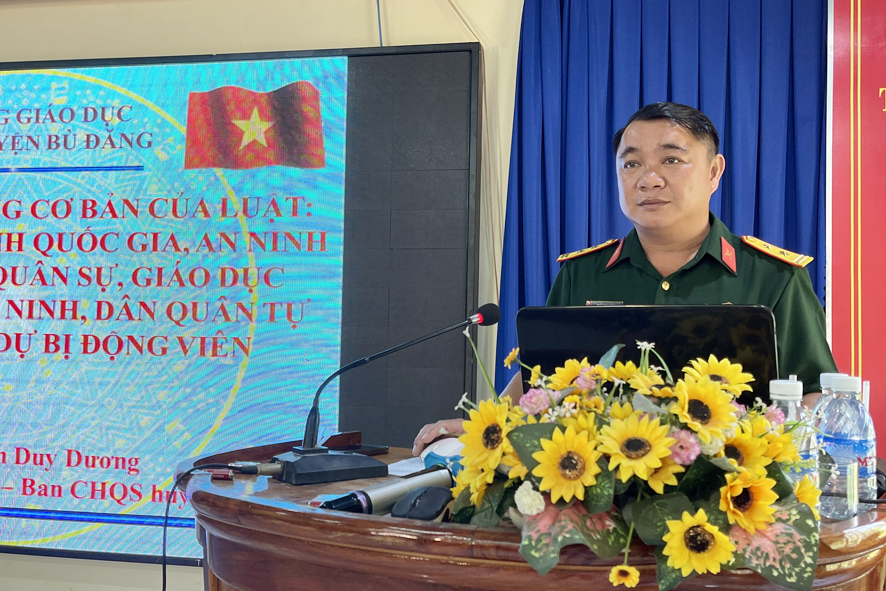Đồng chí Trung tá Trần Duy Dương Phó chỉ huy trưởng Ban chỉ huy quân sự huyện báo cáo chuyên đề 07