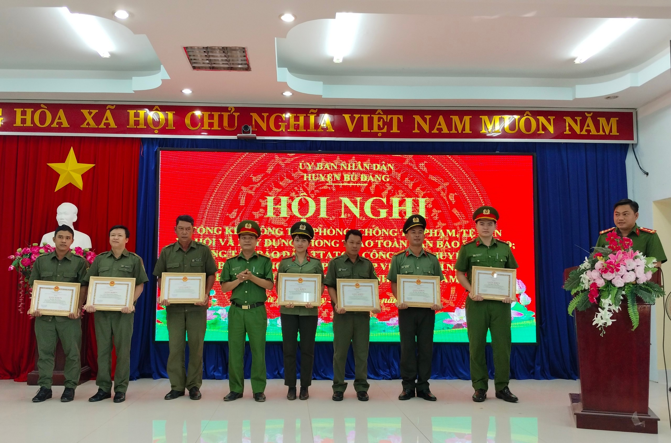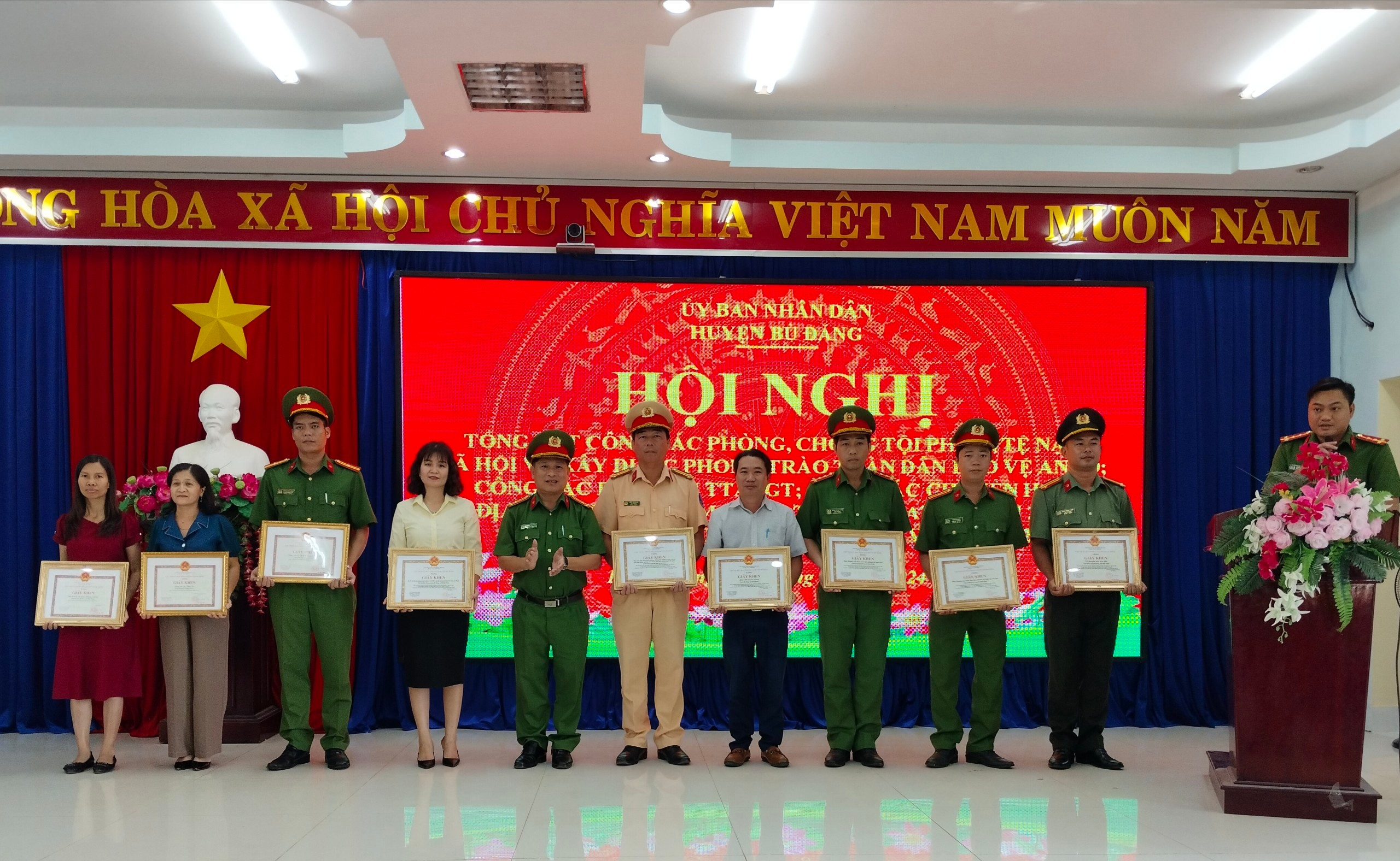 Tại hội nghị UBND huyện đã tặng giấy khen cho 9 tập thể và 16 cá nhân có thành tích xuất sắc trong công tác PCTP, xây dựng phong trào TDBVANTQ, công tác chuyển hóa địa bàn và đảm bảo trật tự an toàn giao thông năm 2023.