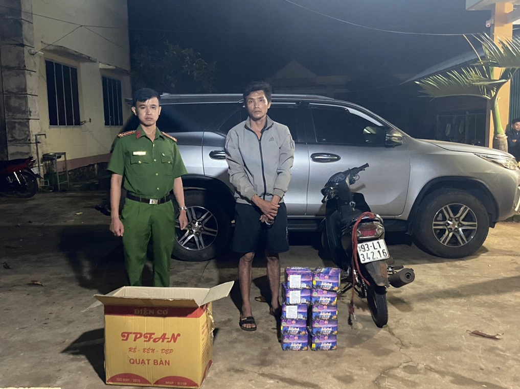 Quá trình kiểm tra xác định: đối tượng tên Lê Đình Đồng; sinh năm: 1994; Nơi thường trú: Thôn 3, xã Minh Hưng, huyện Bù Đăng, tỉnh Bình Phước điều khiển xe mô tô, nhãn hiệu Sirius, màu đỏ đen, biển kiểm soát: 93L1–342.16 trên xe có vận chuyển 01(Một) thùng giấy Carton. Kiểm tra, xác định bên trong thùng giấy Carton có chứa 10 (Mười) khối hình hộp chữ nhật, bên ngoài bọc giấy nhiều màu sắc (nghi là pháo hoa nổ).