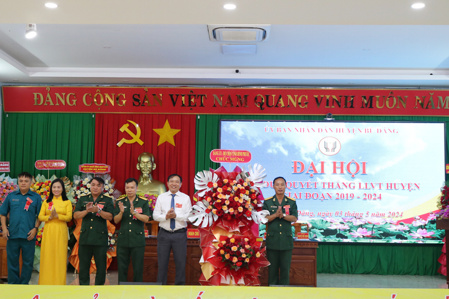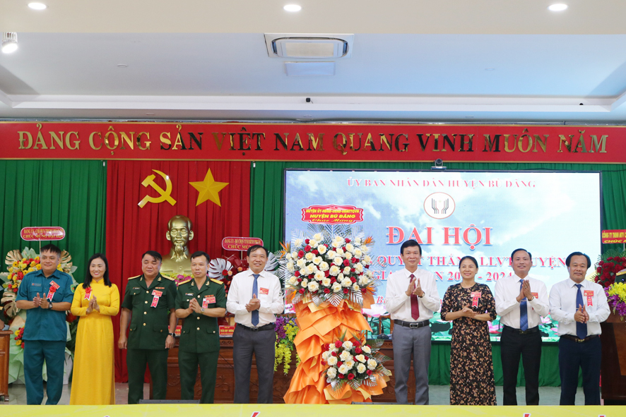 Lãnh đạo Bộ chỉ huy quân sự tỉnh và lãnh đạo huyện ủy, HĐND, UBND, UBMTTQVN huyện Bù Đăng tặng hoa chúc mừng Đại hội
