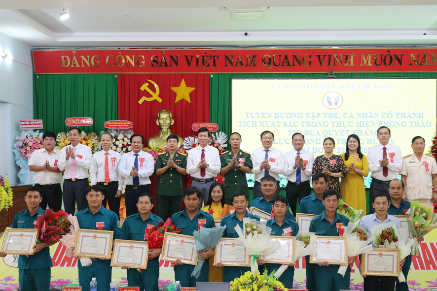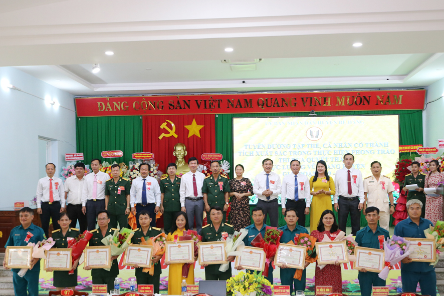 Lãnh đạo Bộ chỉ huy quân sự tỉnh, huyện ủy – HĐND – UBND – UBMTTQVN huyện Bù Đăng chụp hình lưu niệm với các tập thể, cá nhân được Chủ tịch UBND huyện khen thưởng trong phong trào thi đua quyết thắng giai đoạn 2019 -2024