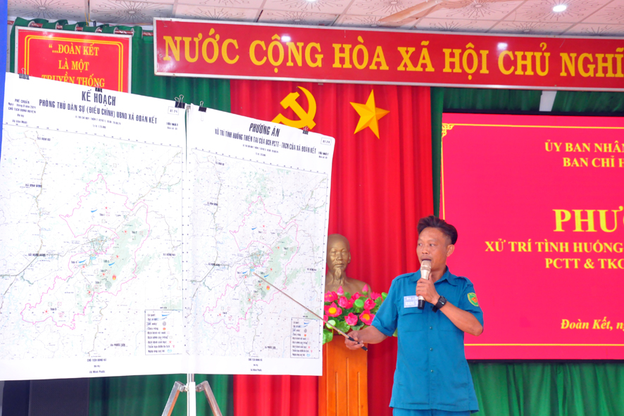 Chỉ huy trưởng Ban chỉ huy Quân sự xã trình bày các phương án hiệp đồng tác chiến trong thực hiện ứng phó khẩn cấp về thiên tai