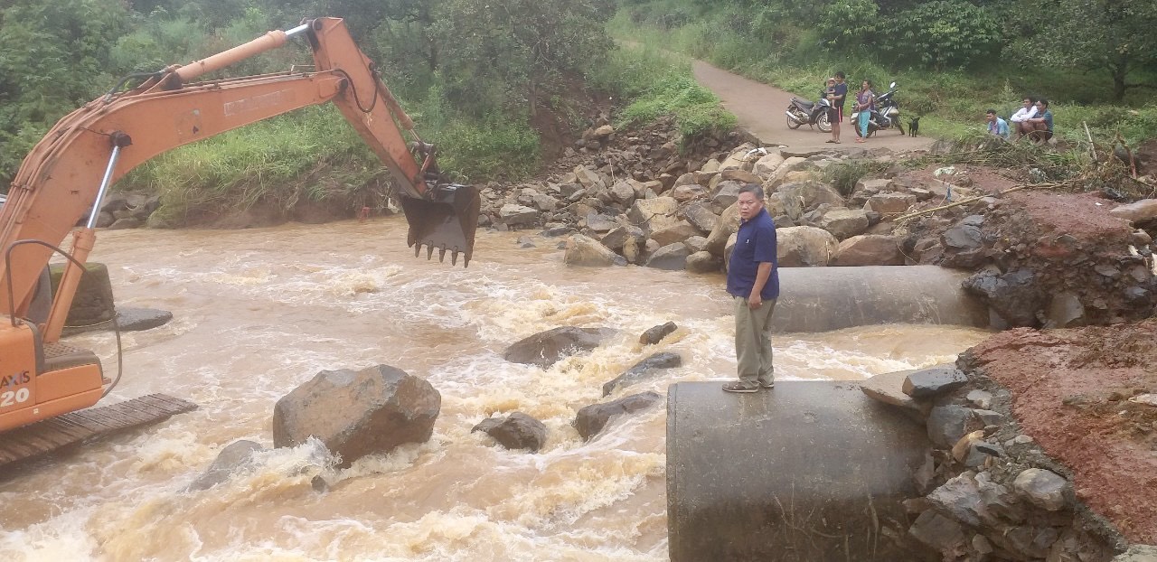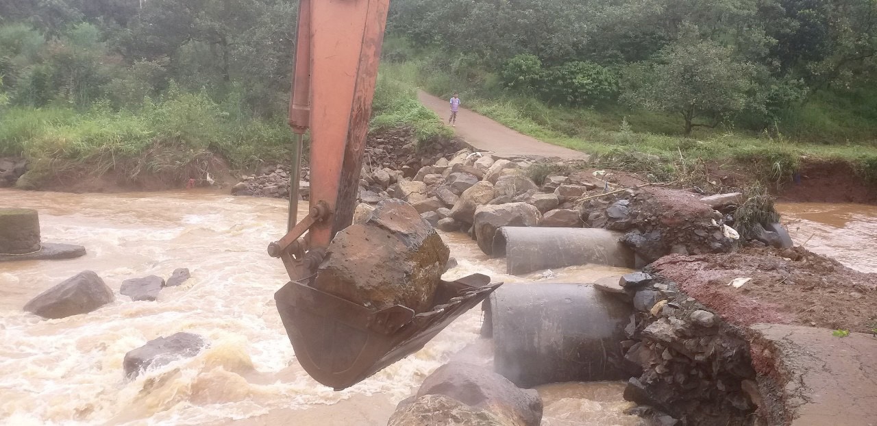 Lãnh đạo xã Đường 10 khảo sát, cho máy múc khơi thông dòng chảy, múc đá, đặt cống tạm khắc phục đoạn đường