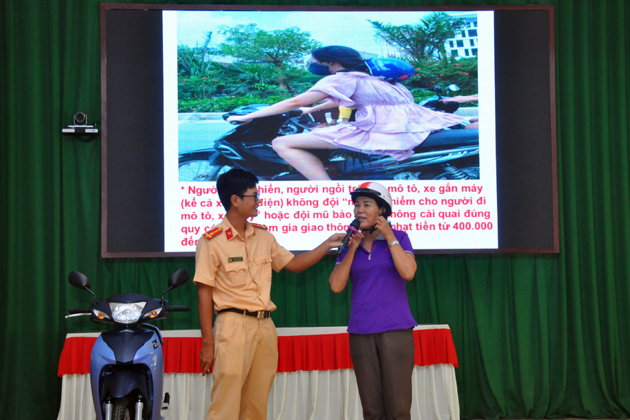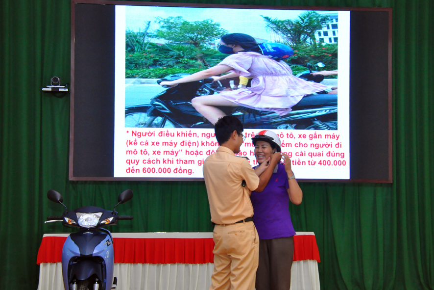 Cán bộ Đội giao thông Công an huyện Bù Đăng hướng dẫn thành viên CLB kỹ năng đội nón bảo hiểm an toàn