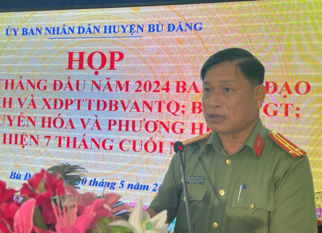 Thượng tá Nguyễn Tấn Phát – Trưởng Công an huyện, phó trưởng ban thường trực ban chỉ đạo báo cáo kết quả hoạt động 5 tháng đầu năm