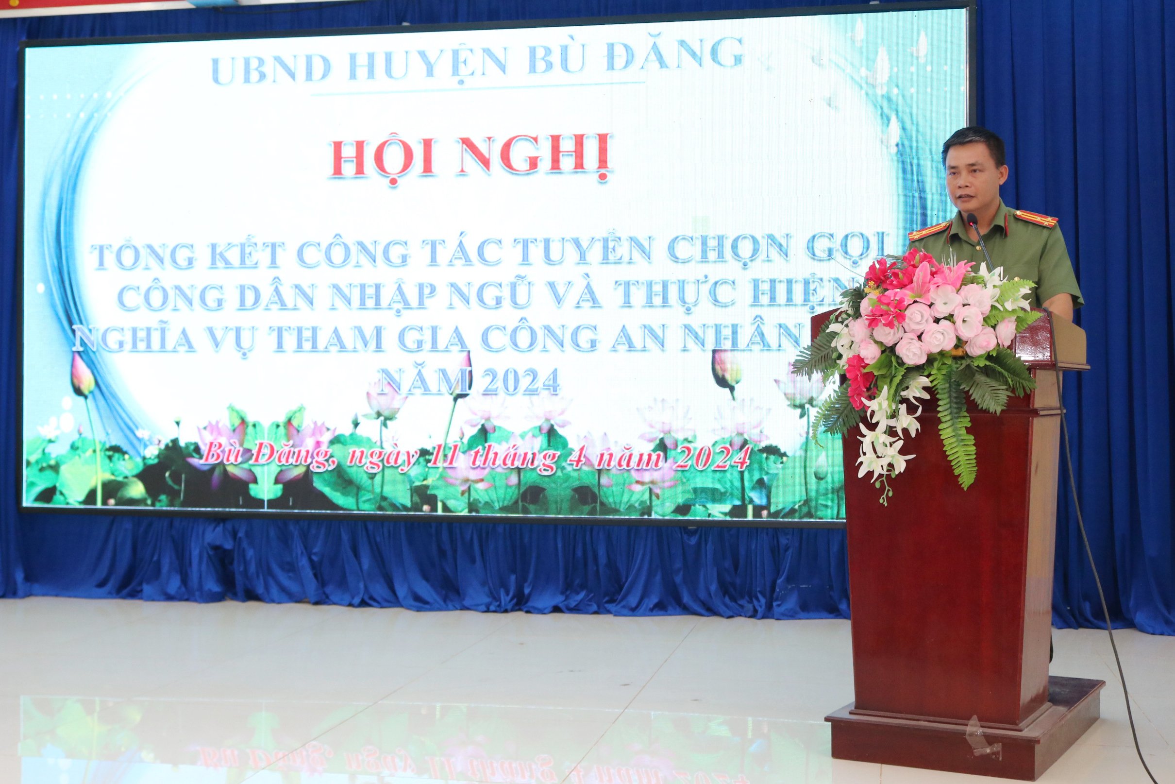 Dịp này, UBND huyện Bù Đăng đã khen thưởng 8 tập thể và 12 cá nhân có thành tích xuất sắc trong công tác tuyển chọn, gọi công dân nhập ngũ và thực hiện nghĩa vụ tham gia công an nhân dân năm 2024./.