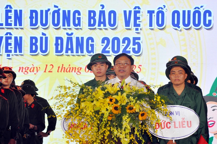 Đồng chí Vũ Văn Mười Phó bí thư huyện uỷ, chủ tịch UBND huyện, chủ tịch Hội đồng nghĩa vụ quân sự huyện Bù Đăng phát biểu chúc mừng các tân binh