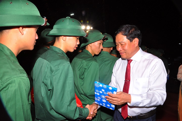 Đồng chí Vũ Lương tỉnh uỷ viên, Bí thư huyện uỷ và đồng chí Vũ Văn Mười Phó bí thư huyện uỷ, chủ tịch UBND huyện, chủ tịch Hội đồng nghĩa vụ quân sự huyện Bù Đăng tặng quà cho các tân binh