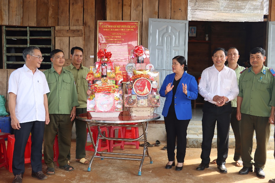 Phó Bí thư Tỉnh ủy, Chủ tịch UBND tỉnh Trần Tuệ Hiền; Đ/c Vũ Văn Mười – PBT, CT.UBND huyện tặng quà cho chốt bảo vệ rừng.