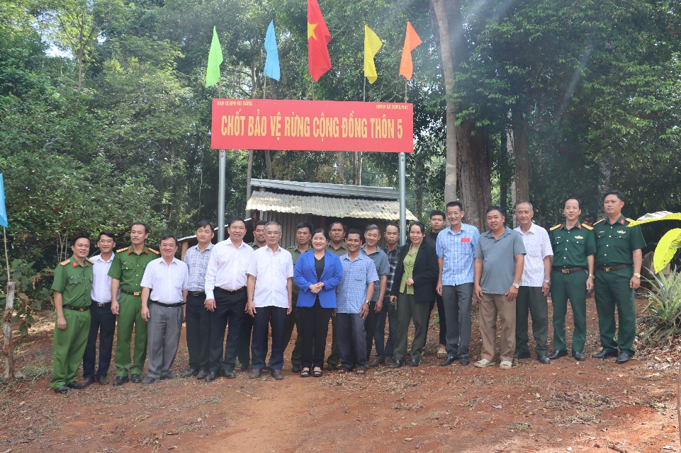 Đoàn thăm và chụp hình lưu niệm với chối bảo vệ rừng cộng đồng thôn 5, xã Đồng Nai.