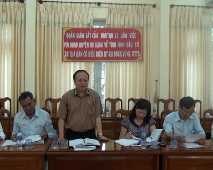 Bù Đăng là huyện miền núi, có diện tích tự nhiên trên 150 ngàn hecta, gần 140 ngàn nhân khẩu, gồm 31 dân tộc anh em cùng sinh sống. Trong đó, có trên 37% là đồng bào dân tộc thiểu số. Trong những năm qua, đời sống của bà con nhân dân trên địa bàn ngày càng phát triển. Các chính sách hỗ trợ cho bà con vùng khó khăn, vùng đồng bào dân tộc thiểu số như chương trình 134, 135, 1592, quyết định 33 của chính phủ, các chính sách hỗ trợ vốn và nhiều chương trình mục tiêu quốc gia khác đã giúp các đối tượng khó khăn ổn định cuộc sống. Tuy nhiên bên cạnh đó vẫn còn không ít khó khăn trong quá trình thực hiện các dự án đầu tư để thúc đẩy kinh tế, đảm bảo an sinh xã hội. Tại buổi làm việc, các đại biểu đã cùng nhau thảo luận các giải pháp để tháo gỡ khó khăn vướng mắc trong quá trình thực hiện các dự án. Thay mặt đoàn giám sát TW ông Giàng A Chu – phó chủ tịch hội đồng dân tộc quốc hội đã ghi nhận các ý kiến của các đại biểu để trình lên quốc hội xem xét trong thời gian tới. Ông yêu cầu huyện trong thời gian tới cần quan tâm lãnh đạo, chỉ đạo thực hiện một số nội dung như: Các dự án đầu tư phải phù hợp với tiềm năng, thế mạnh của huyện; Cấn có các chính sách ưu đãi để thu hút các doanh nghiệp có quy mô lớn đầu tư kinh doanh để tạo công ăn việc làm cho lao động trên địa bàn; kiểm tra và giám sát tiến độ thực hiện các dự án đầu tư ở các xã khó khăn, các dự án an sinh xã hội để kịp thời chỉ đạo thực hiện đạt kết quả cao. Đặc biệt, cần đào tạo nguồn cán bộ địa phương có trình độ, chuyên môn về văn hóa dân tộc bản địa.
