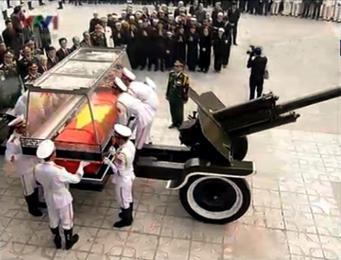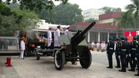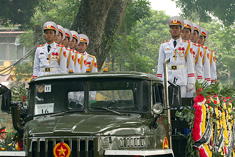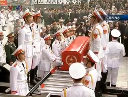 Các tiêu binh đưa linh cữu Đại tướng lên cỗ linh xa chuẩn bị rời Nhà tang lễ