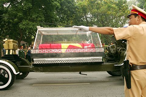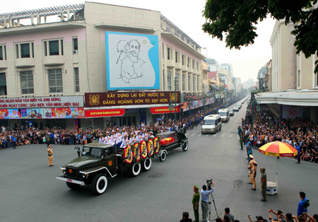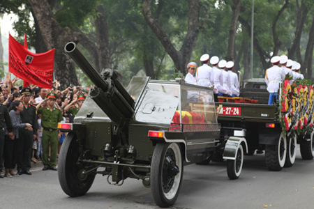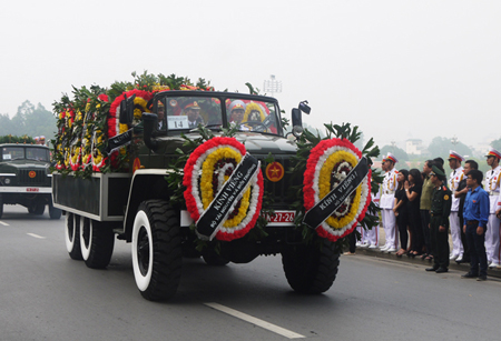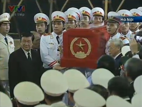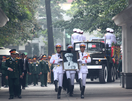 Chủ tịch Quốc hội Nguyễn Sinh Hùng cùng đưa linh cữu Đại tướng rời nhà tang lễ. |