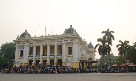 Linh xa đưa linh cữu Đại tướng Võ Nguyên Giáp đi qua Nhà hát Lớn. Ảnh: VGP/Quang Hiếu
