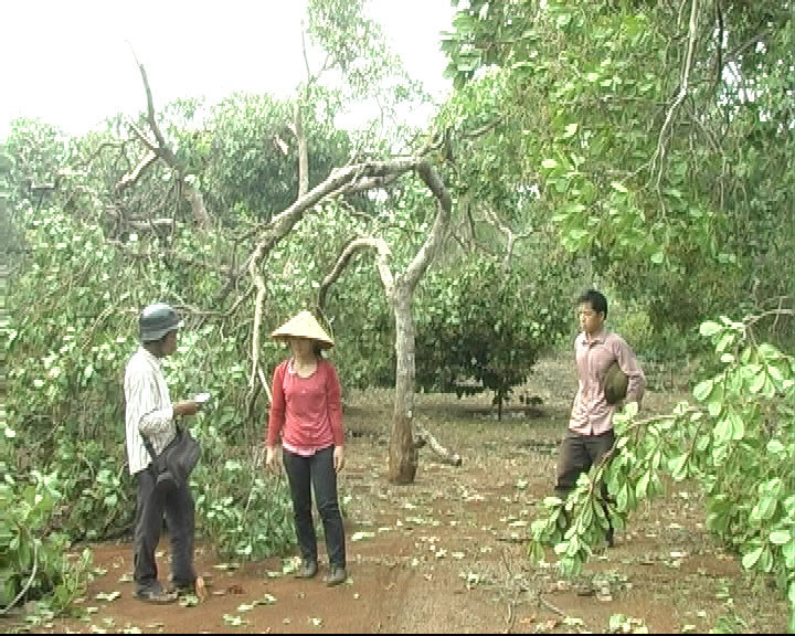 Cùng với đại dịên lãnh đạo UBND xã Đoàn Kết và phòng nông nghiệp phát triển nông thôn huyện Bù Đăng, chúng tôi đã có mặt tại thôn 8 xã Đoàn Kết, thôn bị thiệt hại nặng nhất của xã. Theo nhiều ngừơi dân nơi đây cho biết: cơn giông, kèm theo lốc xoáy chỉ xảy ra trong thời gian rất ngắn nhưng sức mạnh của nó đã quật gẫy đổ, hàng loạt cây điều đang trong thời điểm chuẩn bị thu hoạch. Phần lớn các cây điều bị quật gẫy ngang thân, nhiều cây bị bật gốc, đổ ngã, nằm la liệt. Ông Trần Ngọc Lễ - Bí thư chi bộ thôn 8 xã Đoàn Kết kể lại: lúc đầu chỉ thấy mưa, sau đó thì kèm theo một cơn lốc xoáy rất mạnh, làm cho cây điều ngả đi, ngả lại nằm rạp xuống rồi nó lại lật lên, mọi người ai cũng sợ hãi vì chưa từng thấy cơn lốc nào lại khủng khiếp như vậy, không những thế lại còn sấm sét ầm ầm. Trong khi đó hiện nay hầu hết các diện tích điều đều đang lộn hột, nhiều nhà đang thu lai rai 20 – 30 kg mỗi ngày, thiệt hại của bà con là rất lớn. Gia đình anh Mai Anh Toàn ngụ thôn 8, là một trong số những gia đình bị thiệt hại nhiều nhất, gia đình anh có 8 hecta điều 12 – 14 năm tuổi đang cho thu hoạch năng suất rất cao, cộng với đó là 5 ha cà phê trồng xen cũng đang trong thời kỳ cho thu hoạch, tuy nhiên trận lốc xoáy xảy ra đã làm hầu hết diện tích điều bị quật ngã, một số cà phê cũng bị điều gẫy đổ, đè gẫy gây thiệt hại. Anh Mai Anh Toàn chua sót: hầu hết bà con chúng tôi đều đang vay nợ ngân hàng, vụ này nhà tôi coi như trắng tay, mong sao nhà nước có chính sách dãn nợ cho bà con chúng tôi.