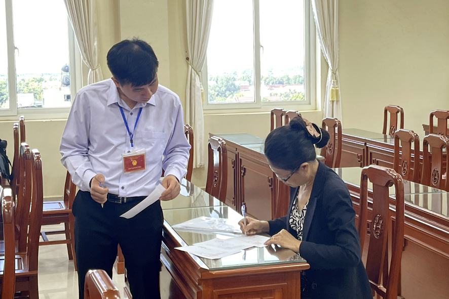 Các đấu giá viên hướng dẫn người tham gia đấu giá viết thông tin vào phiếu đấu giá trước khi bỏ phiếu