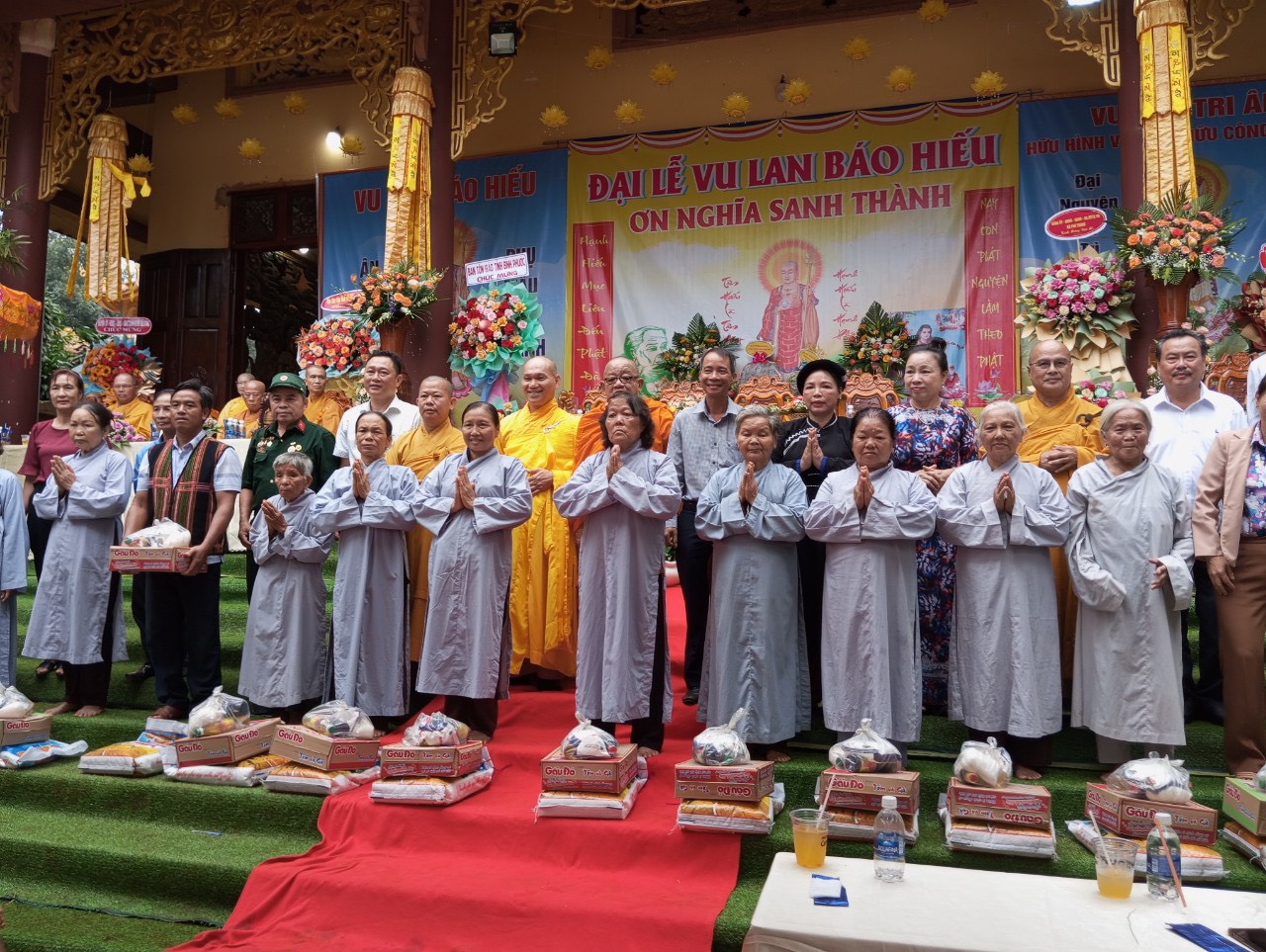 Theo đó, trong chương trình đại lễ Vu Lan báo hiếu, chùa đã tổ chức trao tặng 200 phần quà, mỗi phần trị giá 500 ngàn đồng cho người dân có hoàn cảnh khó khăn, với tổng kinh phí 100 triệu đồng và trao tặng 25 thẻ BHYT cho học sinh thuộc các trường học trên địa bàn xã Nghĩa Trung, mỗi thẻ 840 ngàn đồng với tổng kinh phí 21 triệu đồng, những phần quà và tấm thẻ BHYT đã thể thể hiện tinh thần “tương thân, tương ái”, “lá lành đùm lá rách” của nhà chùa và các mạnh thường quân, nhằm giúp đỡ những người dân nghèo, bớt đi phần nào khó khăn trong cuộc sống.