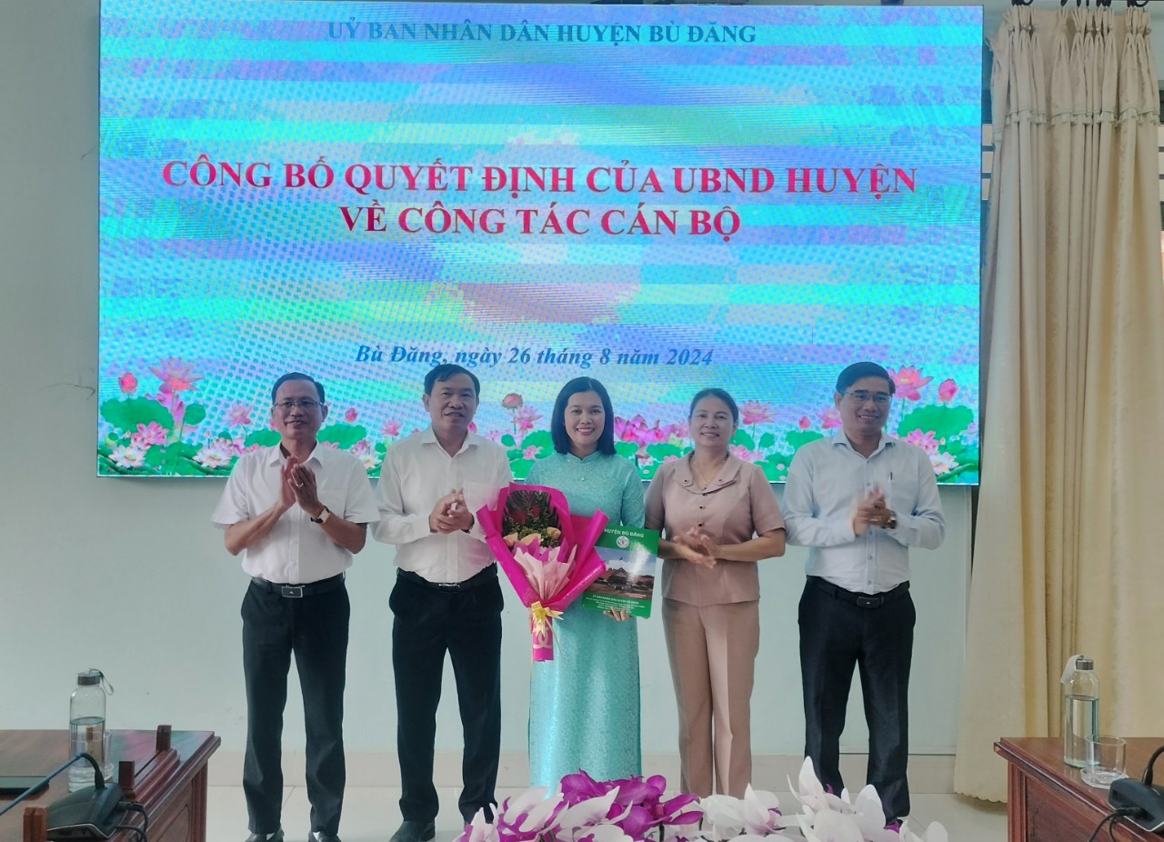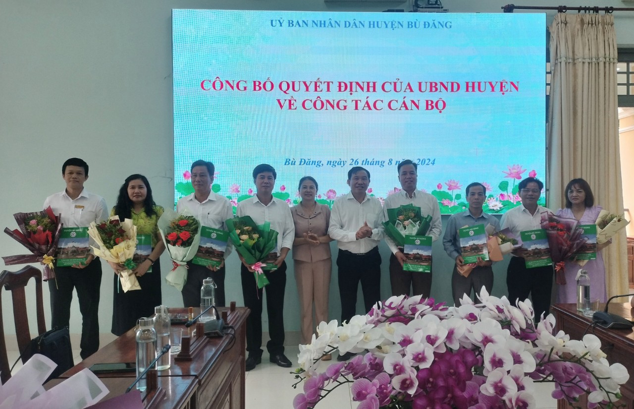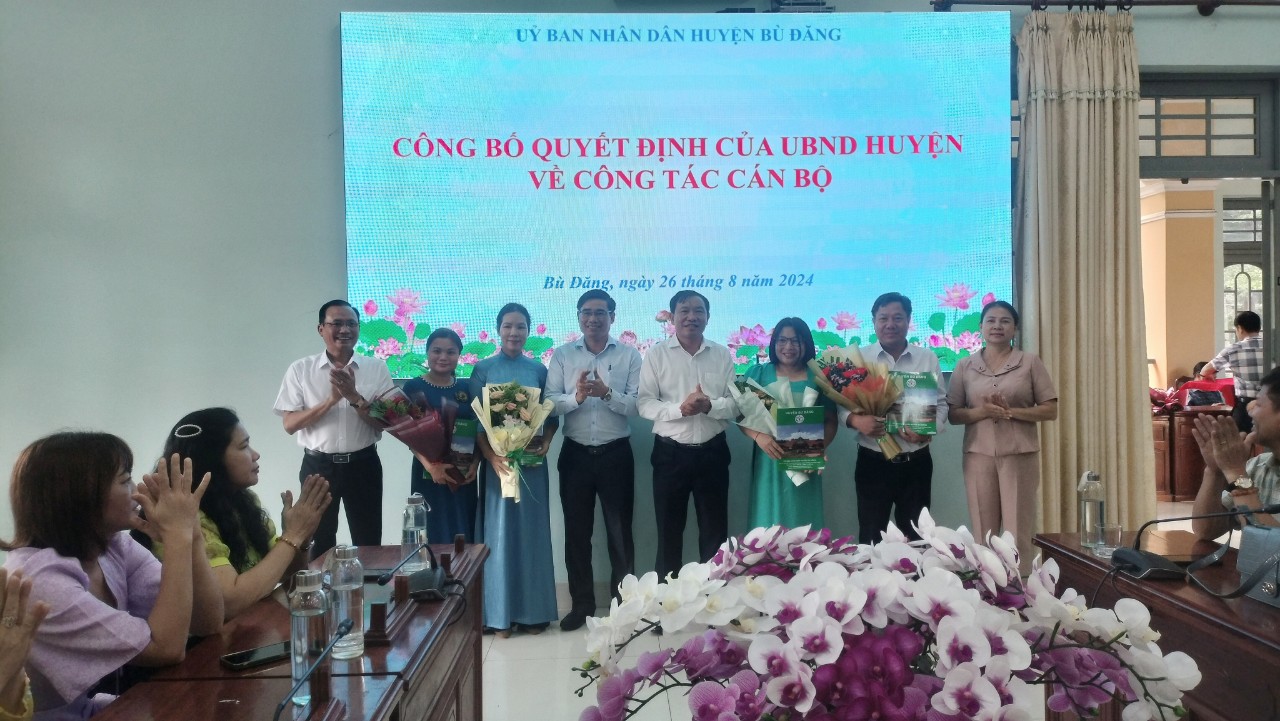 Theo Quyết định của Chủ tịch UBND huyện, đợt này có 36 cán bộ quản lý được nghỉ hưu,điều động, bổ nhiệm và bổ nhiệm lại. Cụ thể, UBND huyện trao các quyết định nghỉ hưu đối với Phó trưởng phòng Tư Pháp huyện, điều động bà Đào Thị Quế - Nguyên Bí thư huyện đoàn đến nhận công tác tại xã Đoàn Kết, công bố quyết định bổ nhiệm mới 4 trường hợp, quyết định bổ nhiệm lại và kéo dài thời gian giữ chức vụ đến khi nghỉ hưu khối Mầm non 13 trường hợp, bổ nhiệm lại 09 trường hợp khối Tiểu học và 08 trường hợp khối THCS.