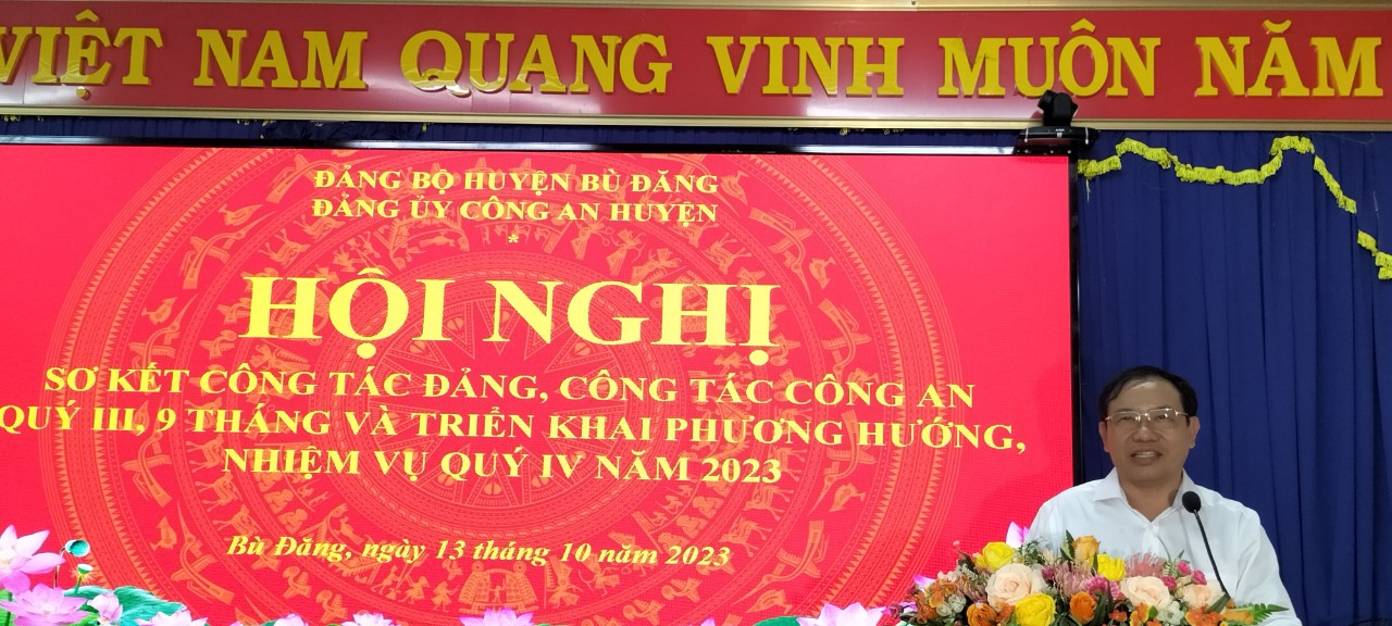 Phát biểu chỉ đạo tại hội nghị Phó Bí thư - Chủ tịch UBND huyện Vũ Văn Mười biểu dương và ghi nhận những thành tích đã đạt được trong 9 tháng qua, đồng thời yêu cầu toàn thể lực lượng Công an huyện tiếp tục phát huy kết quả, thành tích đã đạt, quyết tâm khắc phục tồn tại, hạn chế, nâng cao bản lĩnh chính trị, tinh thần đoàn kết, vì nhân dân phục vụ, ra sức rèn luyện, nỗ lực, phấn đấu vượt qua mọi khó khăn, thử thách, để thực hiện thắng lợi nhiệm vụ phát triển kinh tế, xã hội, đảm bảo quốc phòng an ninh với phương châm “Xây dựng lực lượng Công an huyện Bù Đăng thật sự trong sạch, vững mạnh, chính quy, tinh nhuệ, hiện đại, đáp ứng yêu cầu, nhiệm vụ trong tình hình mới”.
