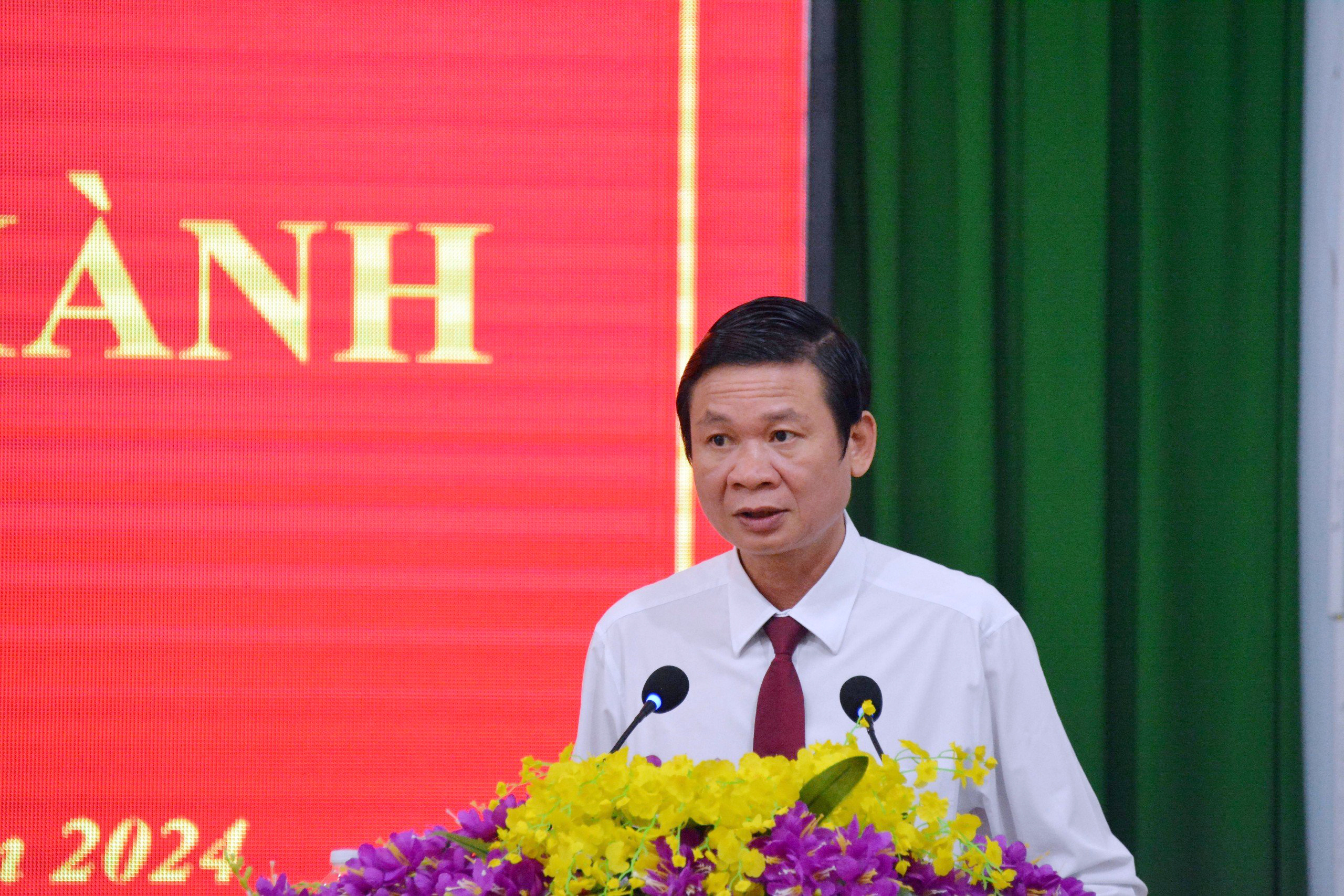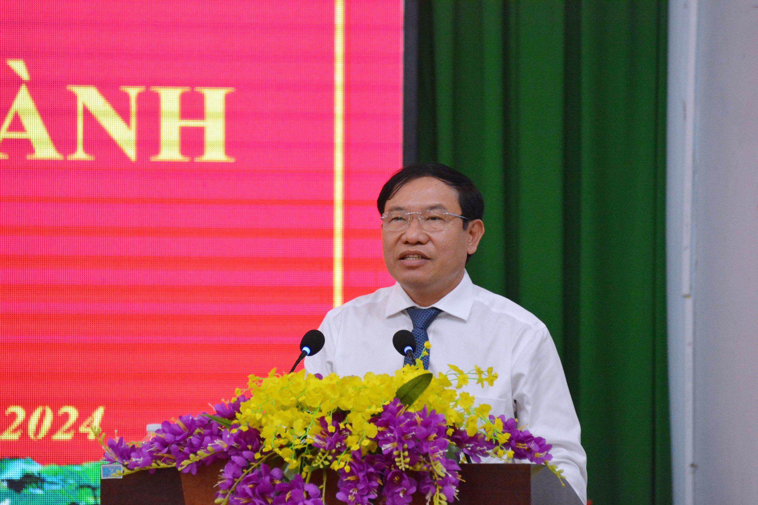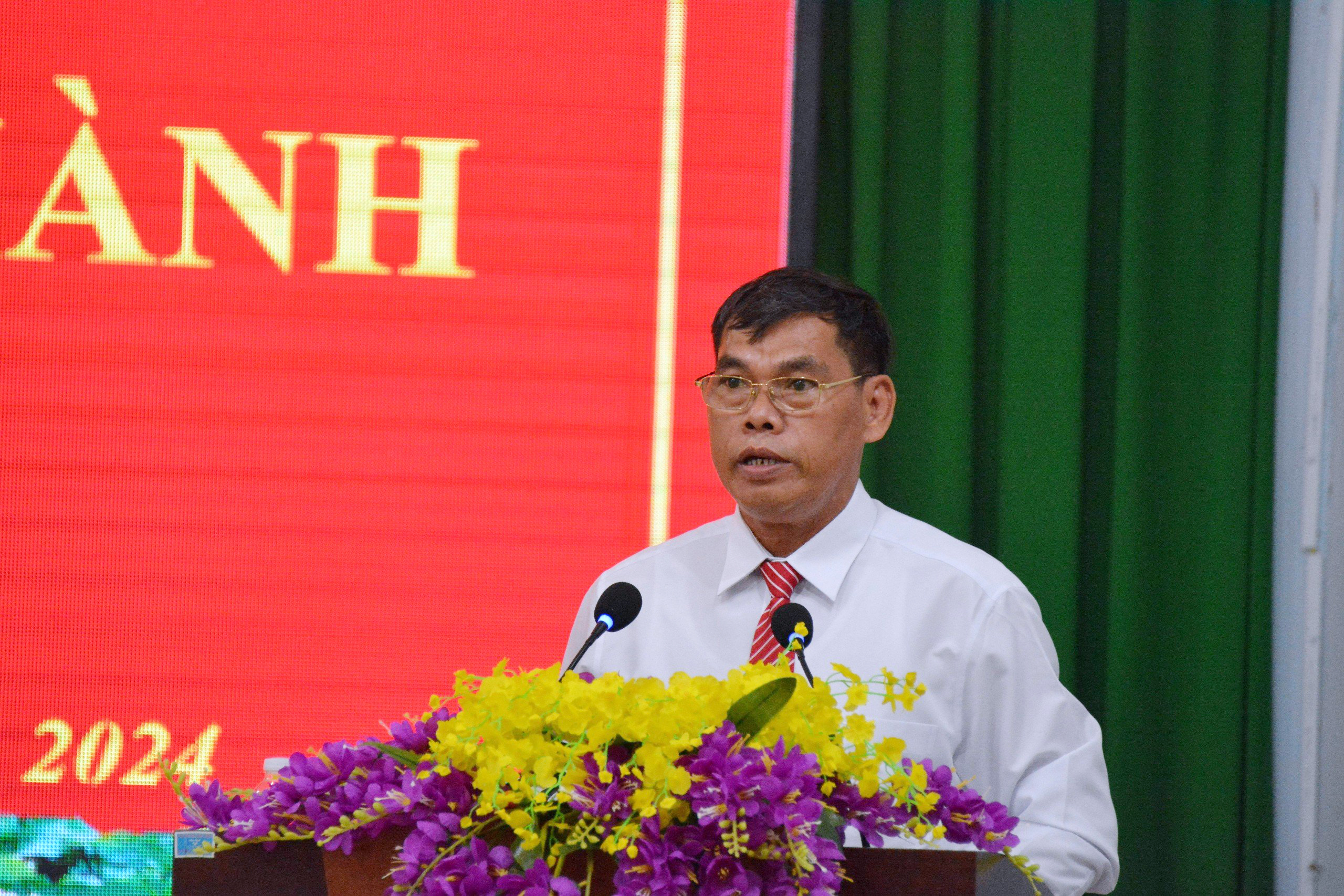 Phó Bí thư thường trực huyện uỷ, chủ tịch HĐND huyện Nguyễn Tấn Hồng báo cáo kết quả thực hiện nghị quyết 6 tháng đầu năm 2024
