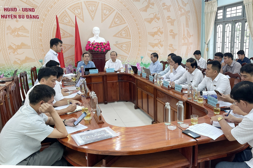 Đại diện lãnh đạo các phòng chuyên môn, đơn vị UBND huyện Bù Đăng và lãnh đạo BQL công ty Điện lực Bình Phước, BQL Dự án lưới điện, Điện lực Miền Nam thảo luận, bàn bạc tại buổi làm việc