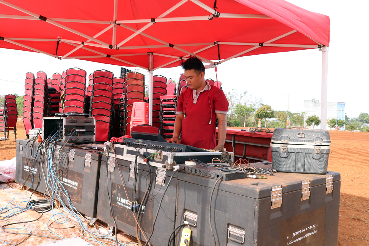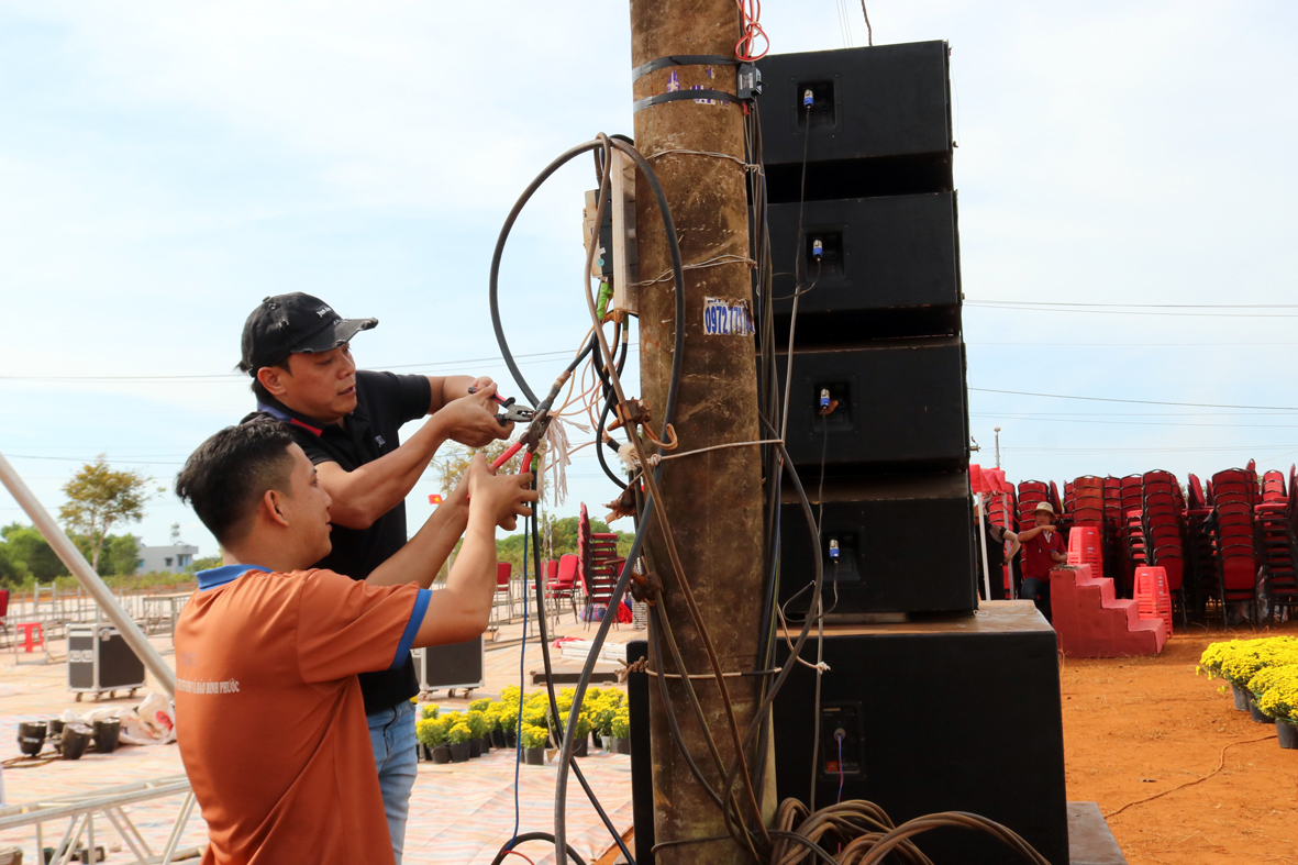 Bộ phận trang trí, thiết kế sân khấu, kĩ thuật âm thanh đang kiểm tra hệ thống loa máy, chỉnh sửa các công đoạn cuối cùng để chuẩn bị cho buổi tổng dợt chương trình vào lúc 19h tối nay 27/1/2025