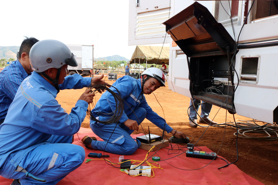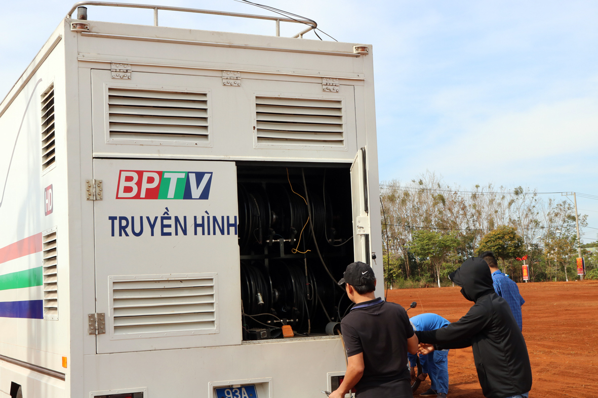 Nhân viên VNPT Bình Phước phối hợp với ekip bộ phận xe màu Đài phát thanh- truyền hình và Báo Bình Phước lắp đặt đường truyền, phục vụ cho cầu truyền hình trực tiếp