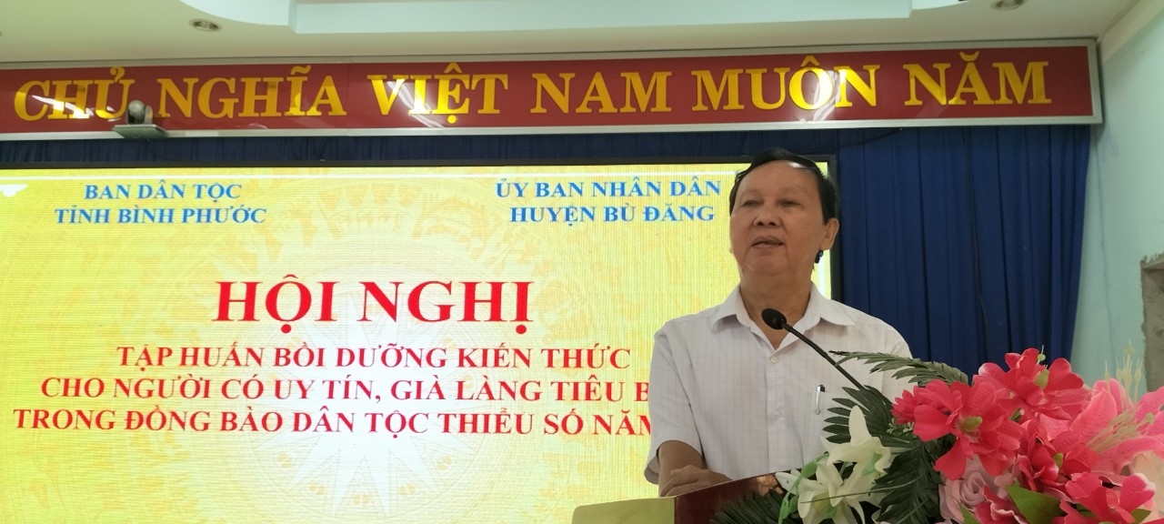 Tham gia hội nghị tập huấn, các đại biểu được nghiên cứu, học tập 4 chuyên đề: Công tác dân tộc, chính sách dân tộc trên địa bàn tỉnh Bình Phước; phát huy vai trò của người có uy tín, già làng tiêu biểu trong than gia triển khai, thực hiện các cuộc vận động, phong trào thi đua; một số nội dung về văn hóa dân tộc, giữ gìn và phát huy bản sắc văn hóa dân tộc; kỹ năng, nghiệp vụ hòa giải trong công tác phối hợp tham gia hòa giải cơ sở ở vùng đồng bào dân tộc thiểu số.