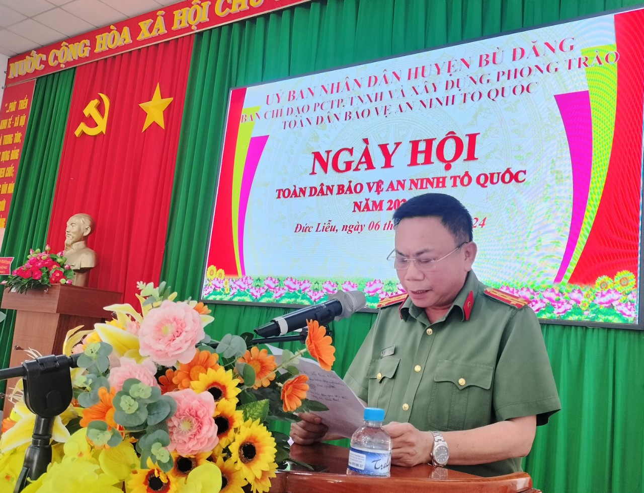 Đại Tá Nguyễn Phương Đằng, Ủy viên ban thường vụ Tỉnh ủy, Phó Giám đốc Công an tỉnh Bình Phước phát biểu chỉ đạo tại ngày hội.