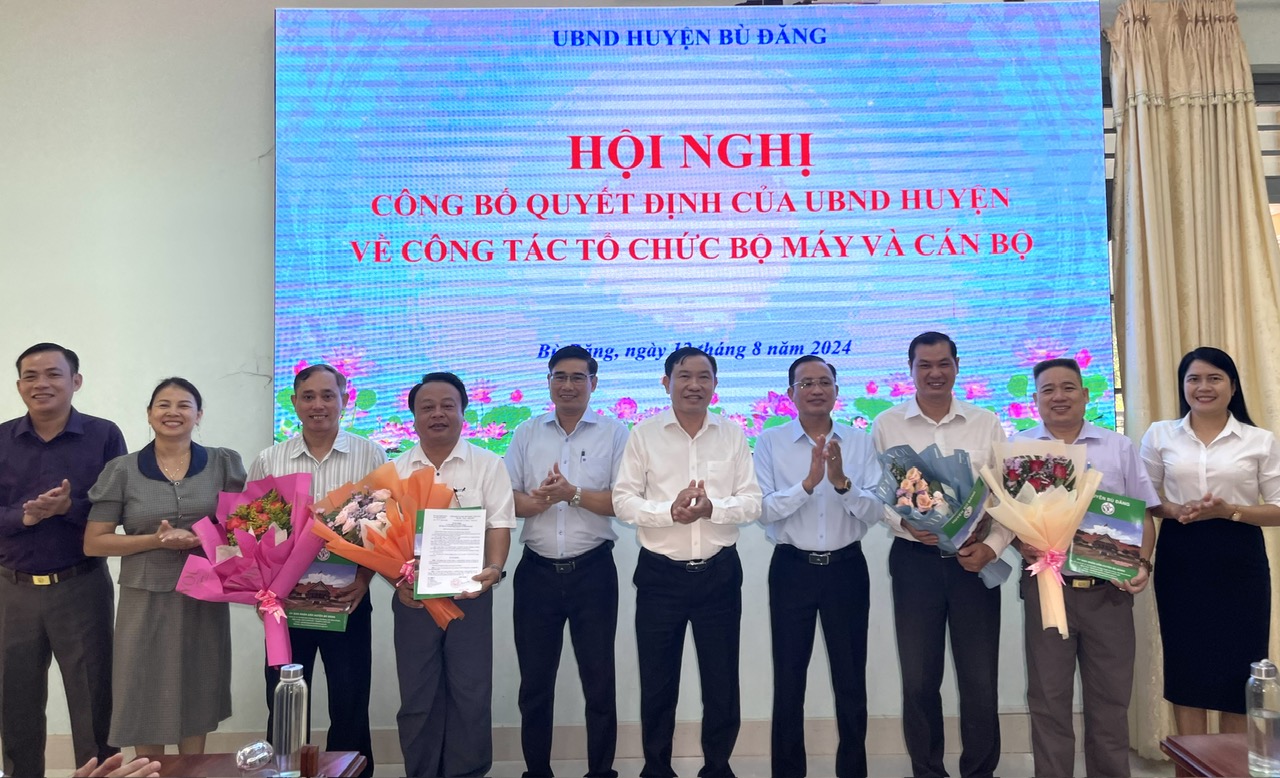 Tại hội nghị lãnh đạo Phòng Nội vụ, công bố các quyết định của CT.UBND huyện: Bổ nhiệm ông Vũ Đức Hoàng - Giữ chức vụ Trưởng Phòng Văn hóa và Thông tin, thời gian bổ nhiệm 05 năm, kể từ ngày 04/5/2024; Điều động và bổ nhiệm ông Lê Đức Tú - Giữ chức vụ Phó Trưởng phòng Văn hóa và Thông tin huyện; Bổ nhiệm ông Phạm Anh Tuấn - Giữ chức vụ Giám đốc Trung tâm Văn hóa-Thể thao và Đài truyền thanh-Truyền hình huyện Bù Đăng; Bổ nhiệm ông Vũ Phú Quang - Giữ chức vụ Phó Giám đốc Trung tâm Văn hóa-Thể thao và Đài truyền thanh-Truyền hình huyện Bù Đăng. Các chức danh trên có thời hạn bổ nhiệm 05 năm, kể từ ngày 12-8-2024.
