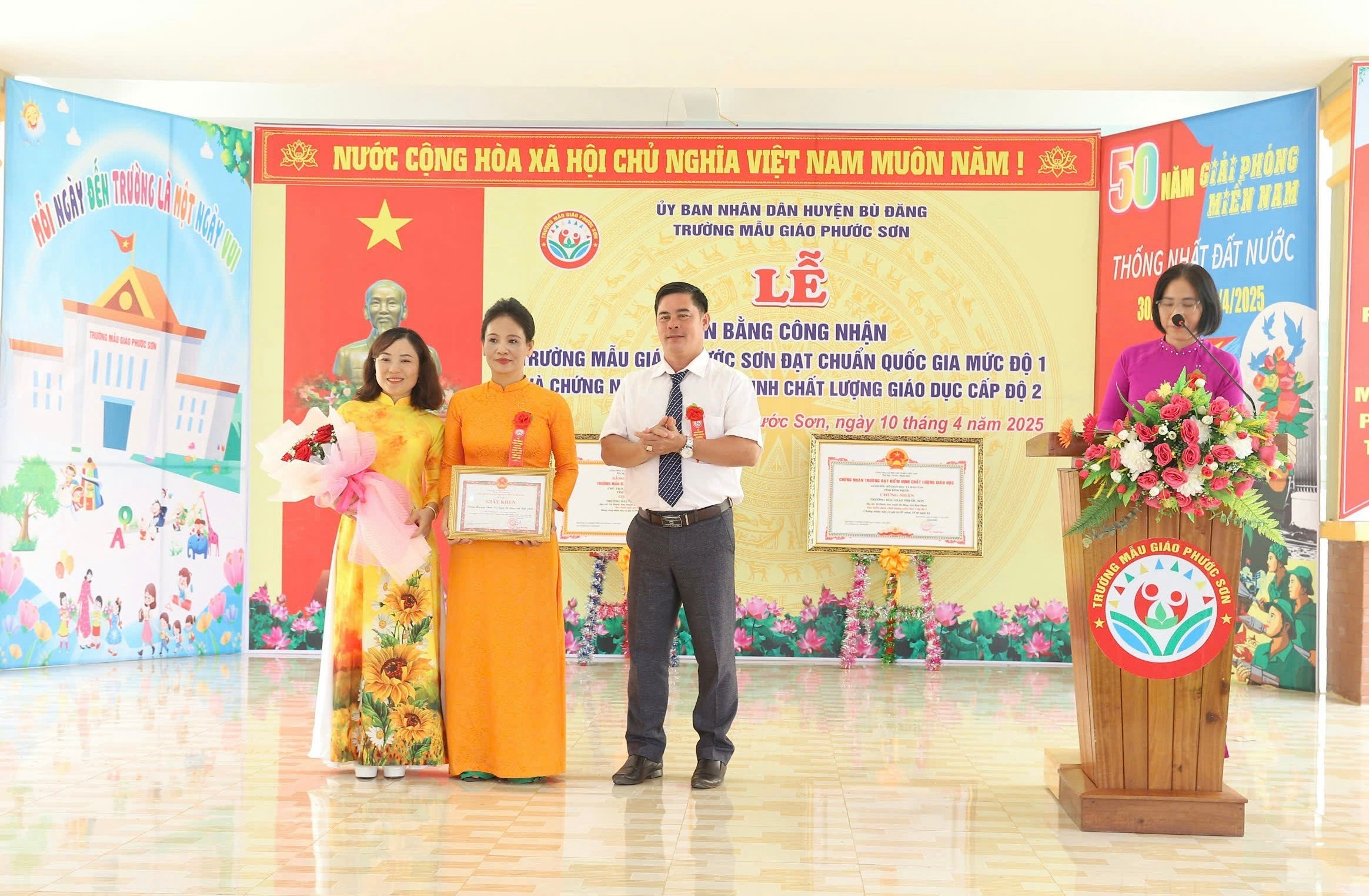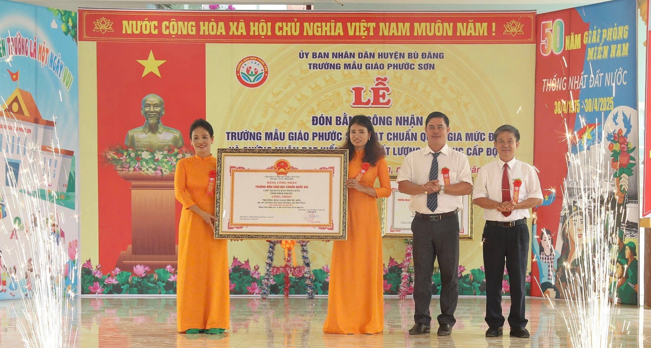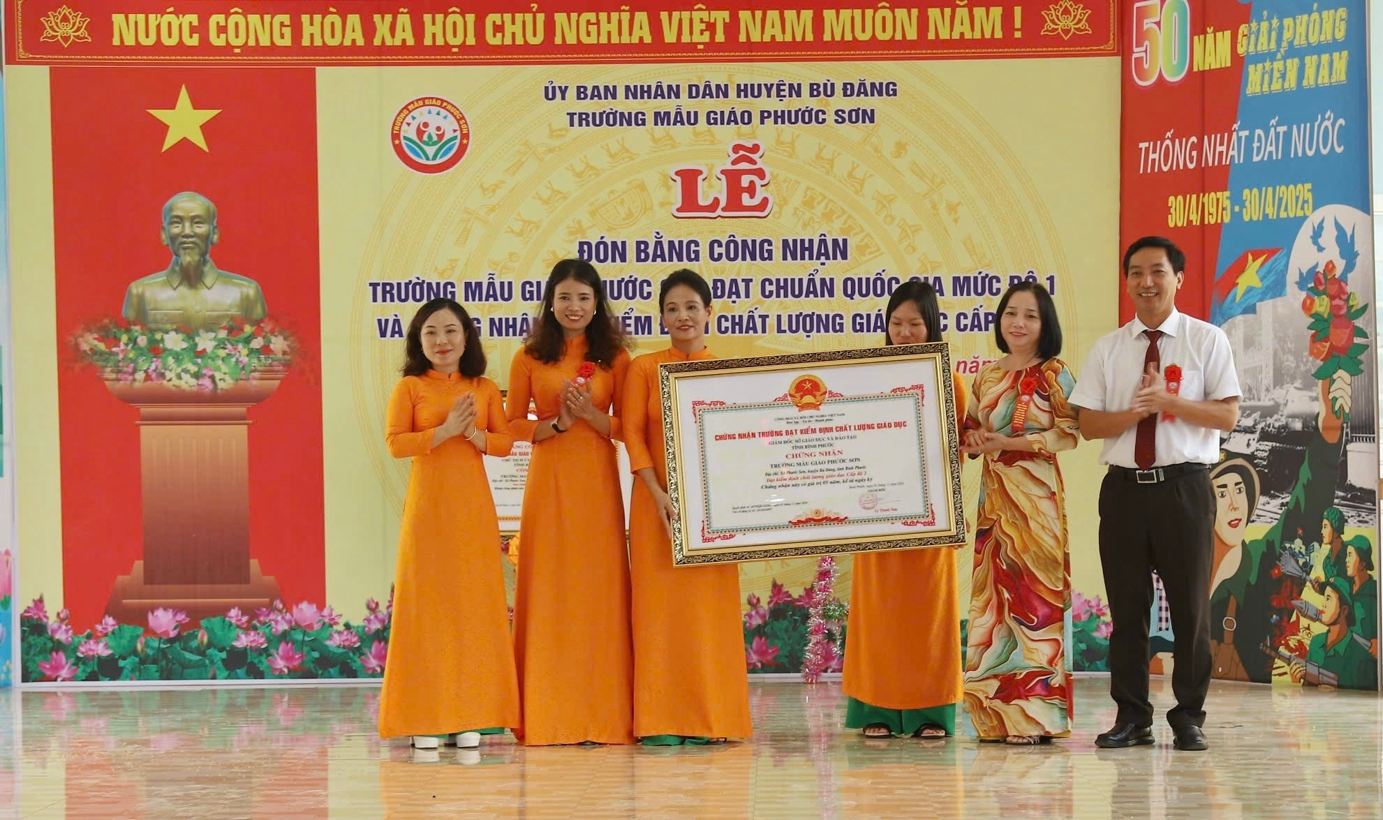 Sáng ngày 10 - 4, Trường Mẫu giáo Phước Sơn, xã Phước Sơn, huyện Bù Đăng, long trọng tổ chức lễ đón Bằng công nhận trường đạt chuẩn Quốc gia mức độ 1 và công nhận đạt kiểm định chất lượng giáo dục Cấp độ 2. Về dự lễ có bà Vũ Thị Kim Huệ - Phó Trưởng phòng giáo dục Tiểu học-Mầm non Sở GD&ĐT; ông Nguyễn Văn Phát – Trưởng phòng GD&ĐT huyện; ông Bùi Xuân Thế - PCT.UBMTTQVN huyện; lãnh đạo Đảng uỷ, HĐND, UBND, UBMTTQVN xã Phước Sơn, đại diện Ban Giám hiệu các trường Mẫu Giáo, Mầm Non trên địa bàn huyện.